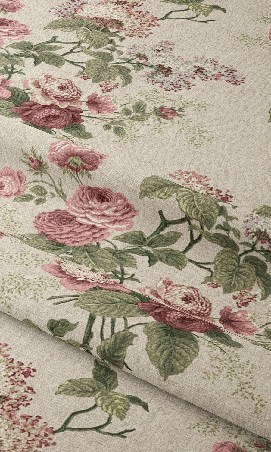- Its scattered posies of lush larkspurs and rambling roses, unfurling the timeless romance of an English garden in full bloom