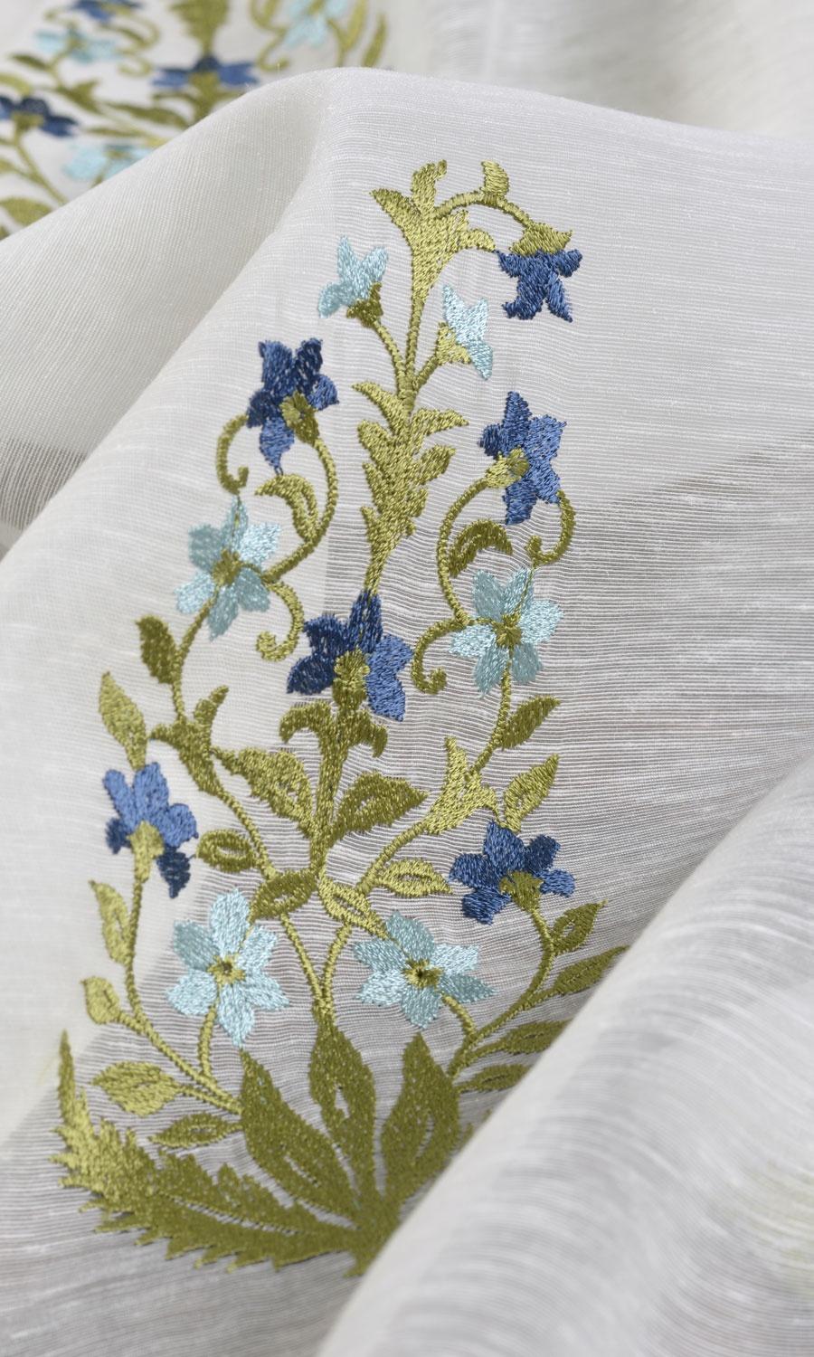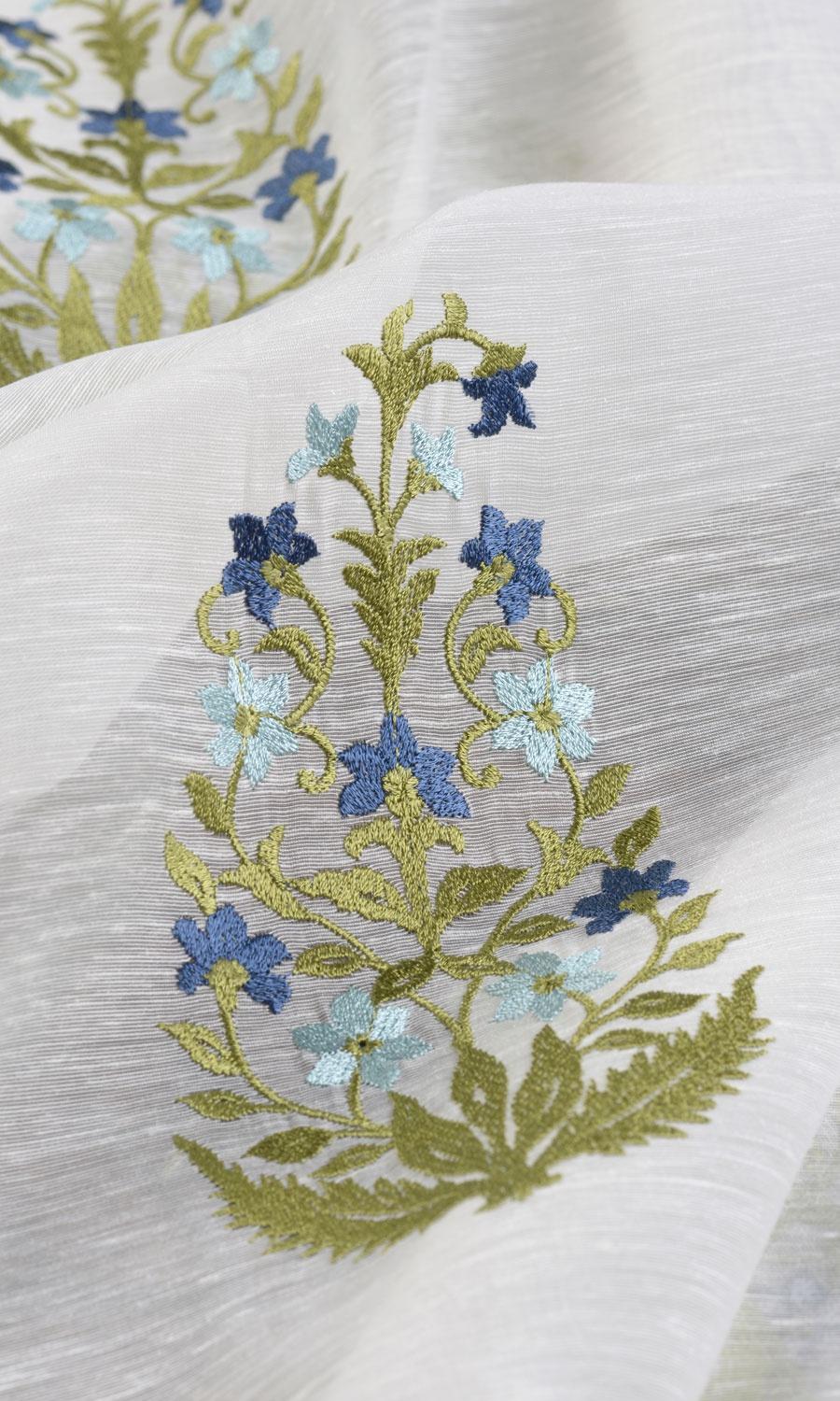 A showstopper paisley. Floral elegance in graceful colors and nimble embroidery merge with paisley to make a jaw-dropping feat. Eymen will veritably steal the show, not with fanfare and hullabaloo, but with a soft whisper, a gentle breeze, a silent gaze! Pair with solid blue drapery in a dreamy bedroom or let it shine alone on a sunny patio door - this diva will set the stage ablaze.