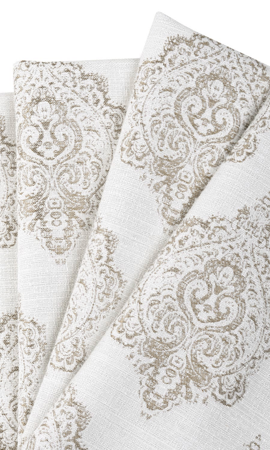 Firefly stands out with its 'traditional pattern meets modern treatment' look. The base off-white fabric with pale beige detailing - carrying undertones of green - gives a texturally rich woven feel. The oversized botanical motif with buds, tendrils and decorative elements reminds of French palaces and Moroccan mansions. Its slightly smudged look and diagonal placement add an interesting dimension to it. Very sober yet very stylish.