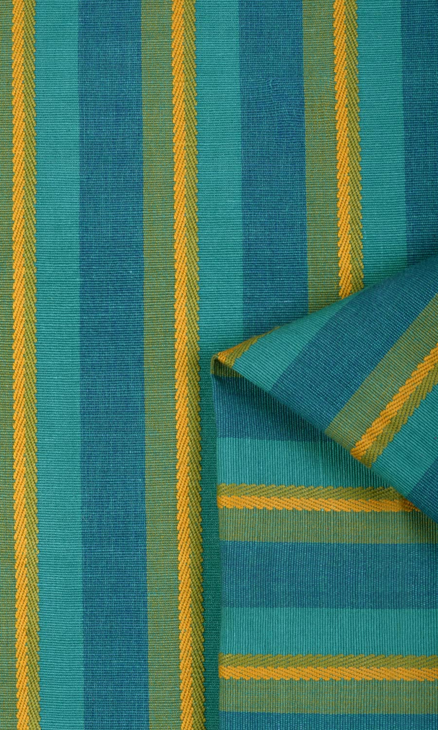 Part of our swoon-worthy cotton collection, Besong features a vertical woven stripe of mustard yellow on the most wonderful shade of blue. It is a simple yet effective design that works in many decor settings. With a raw, softly tactile feel and its body of teal and mustard, Besong feels like a modern take on cotton, so cozy and full of flavor. The medium weight cotton falls beautifully and never fails to impress - no matter what the heading style - from the fullness of pinch pleats to the minimalist look of an eyelet heading.