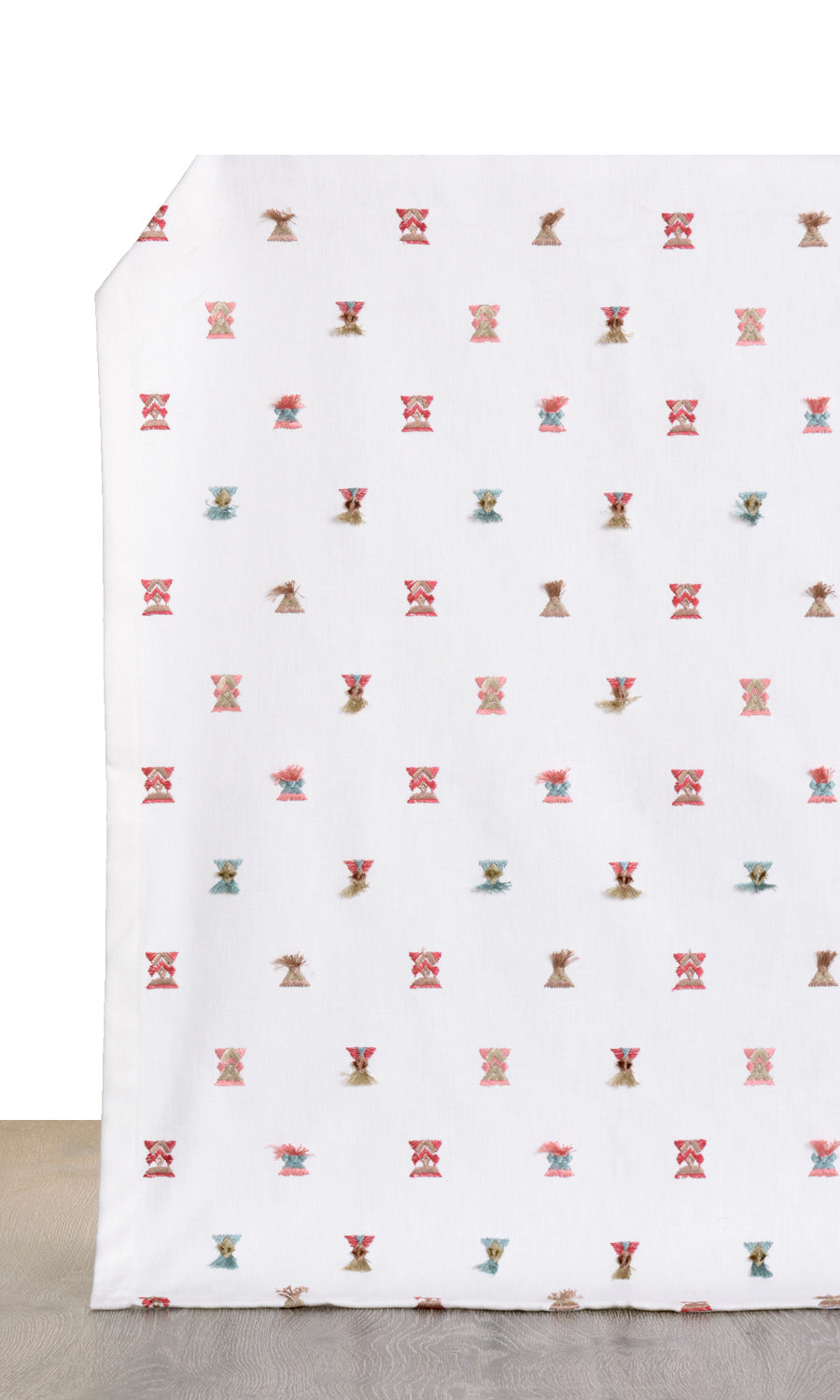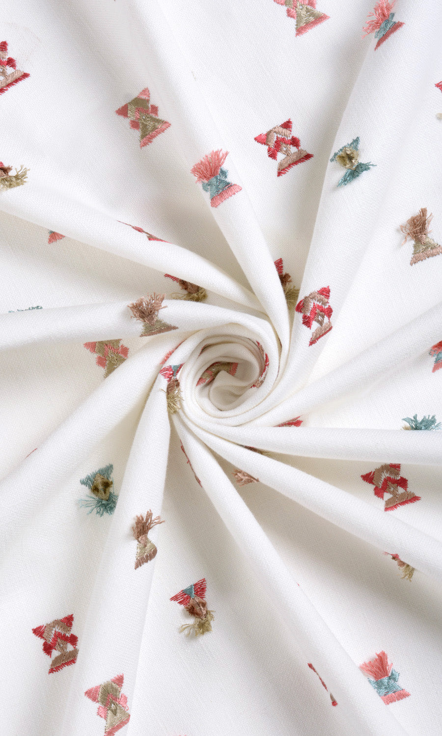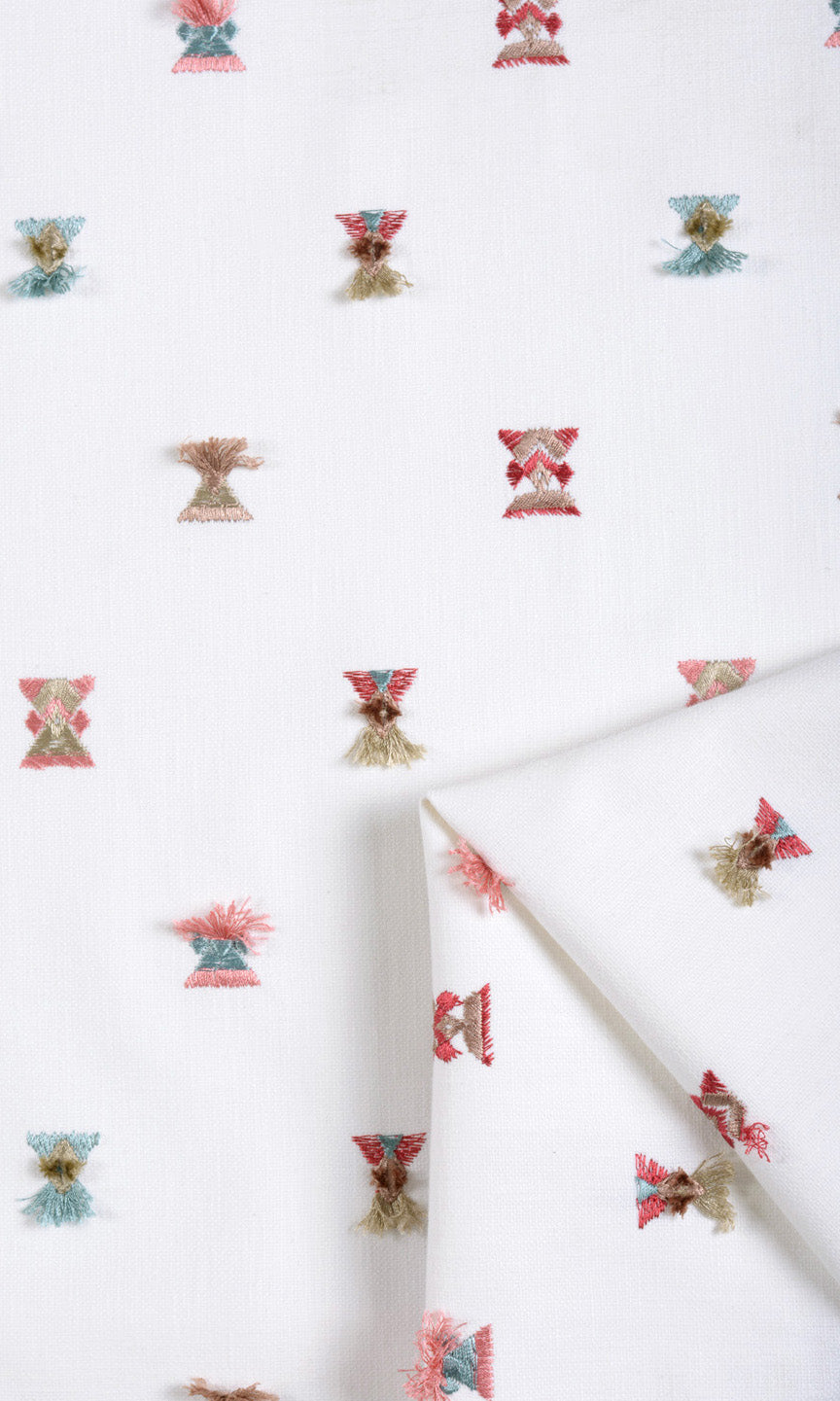 A designer drapery fabric for spaces that need a brightening touch. Its pure white base has been embroidered with tip-to-tip twin triangle motifs in eye-catching combinations of crimson red, coral pink, sky blue and latte beige colors. Some of these motifs are tasseled and add a quirky touch. Delightfully different, that's Flamingo Wings.