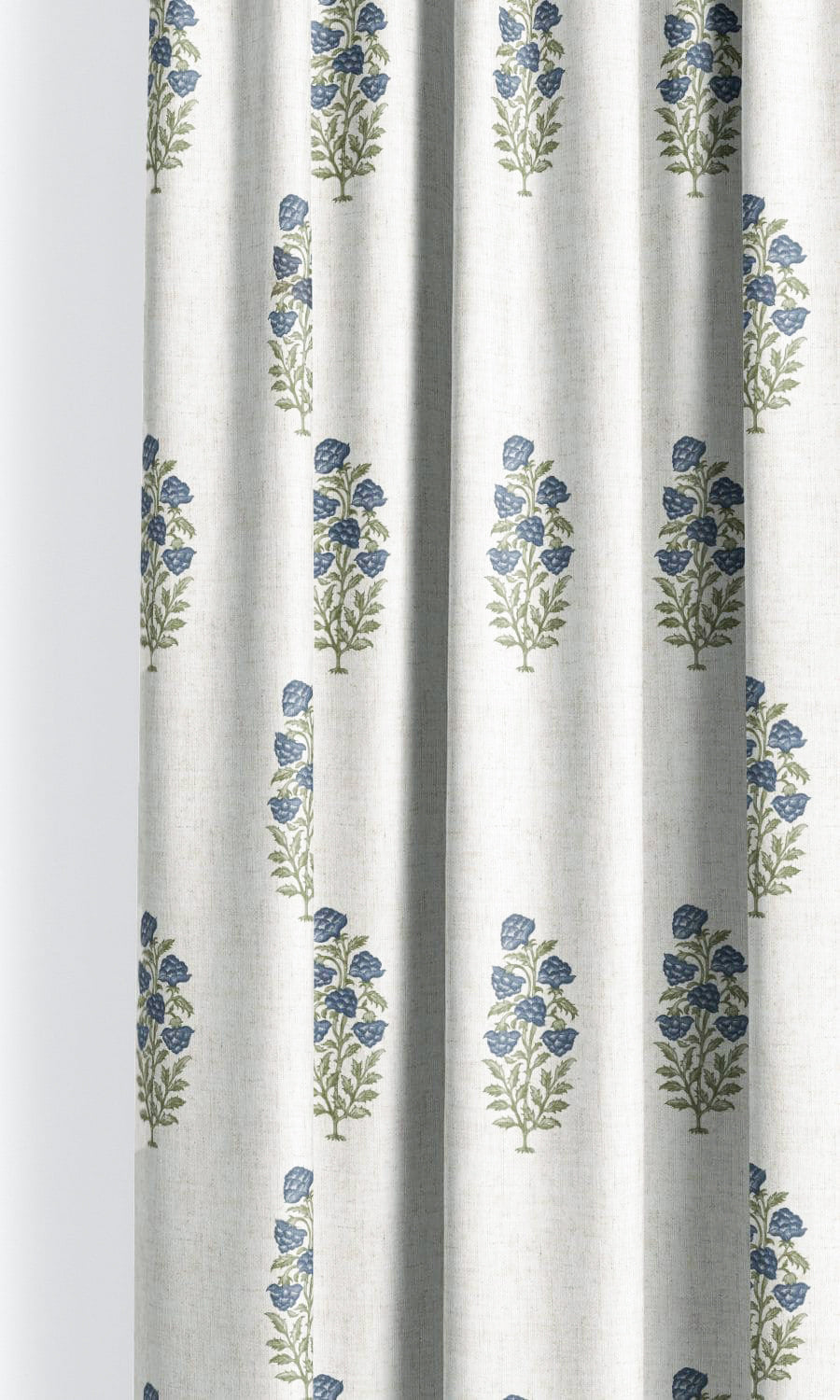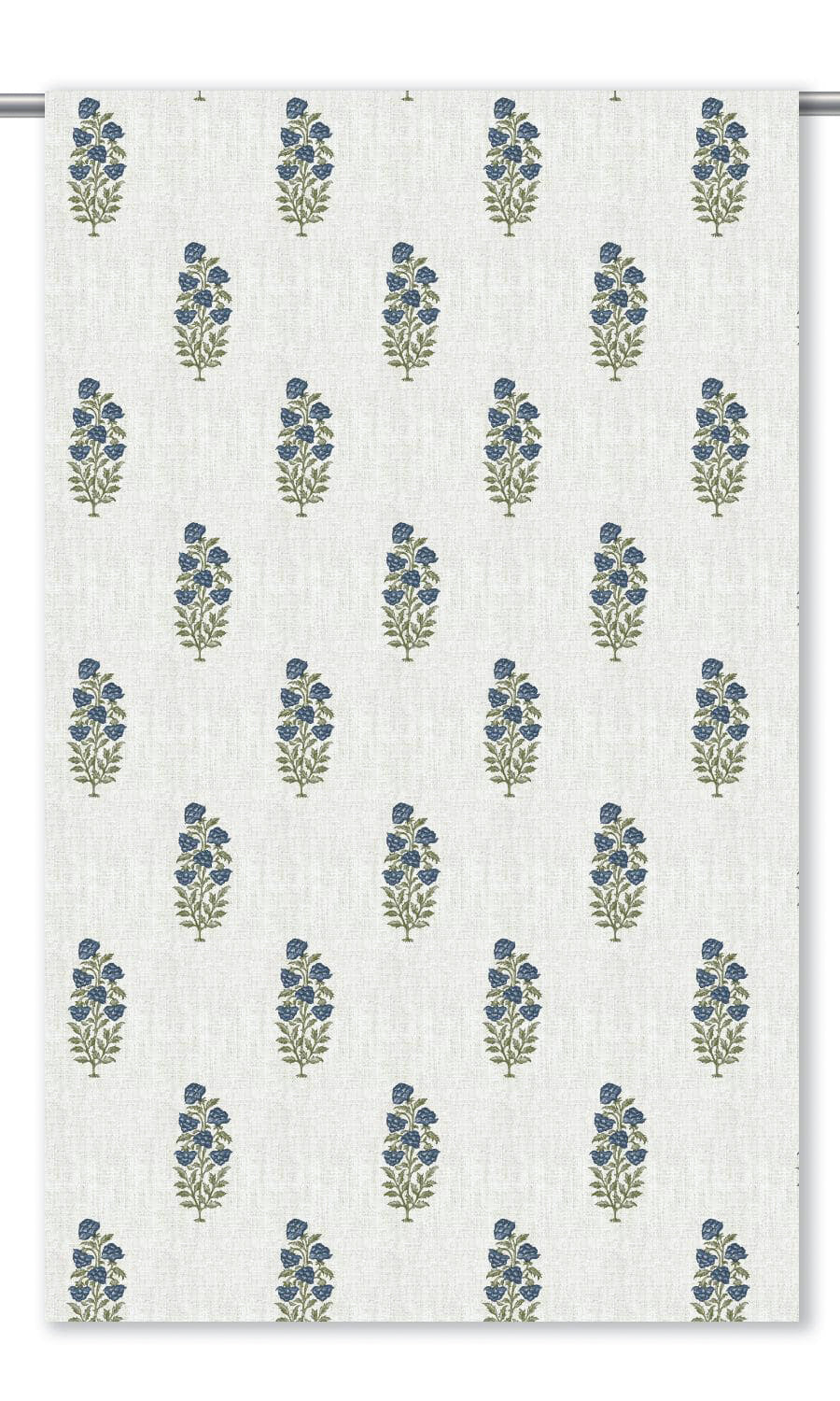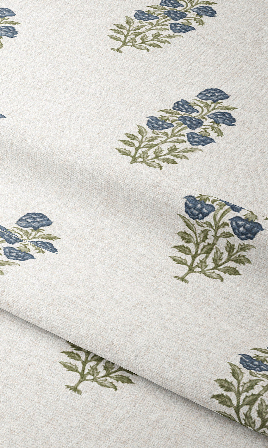 - A parchment white canvas where navy blue and green stage a floral tableau with delicate elegance