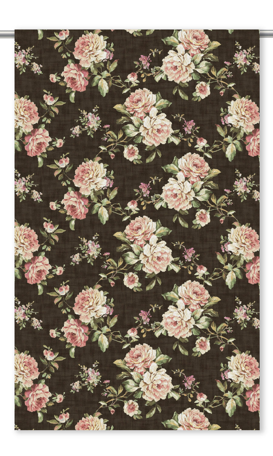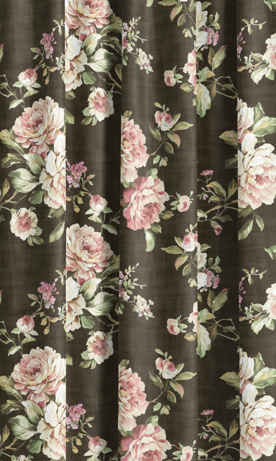 - Blush pinks and pale greens unfurl in an English floral reverie against the moody allure of coffee brown