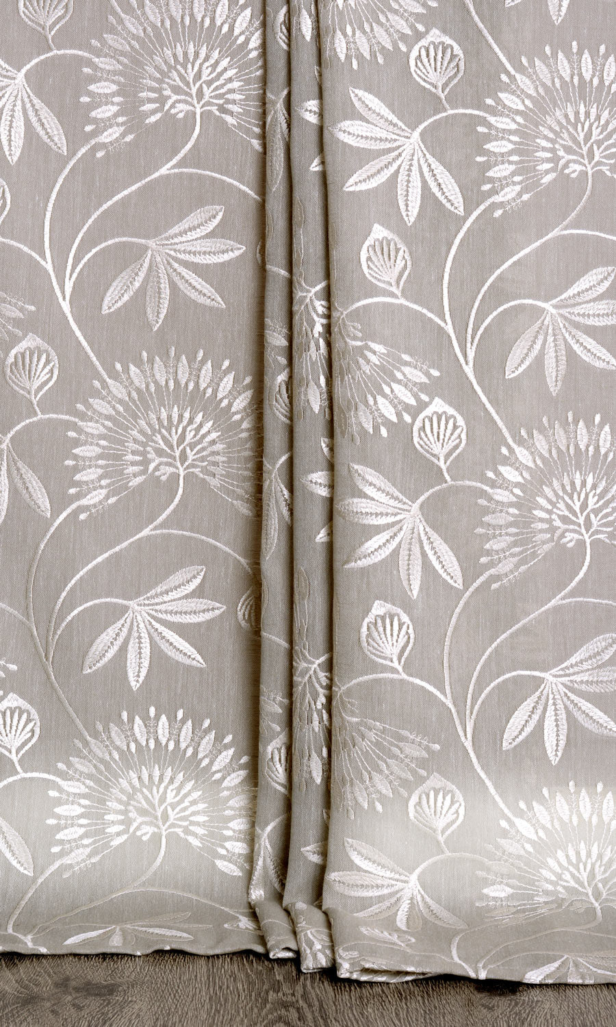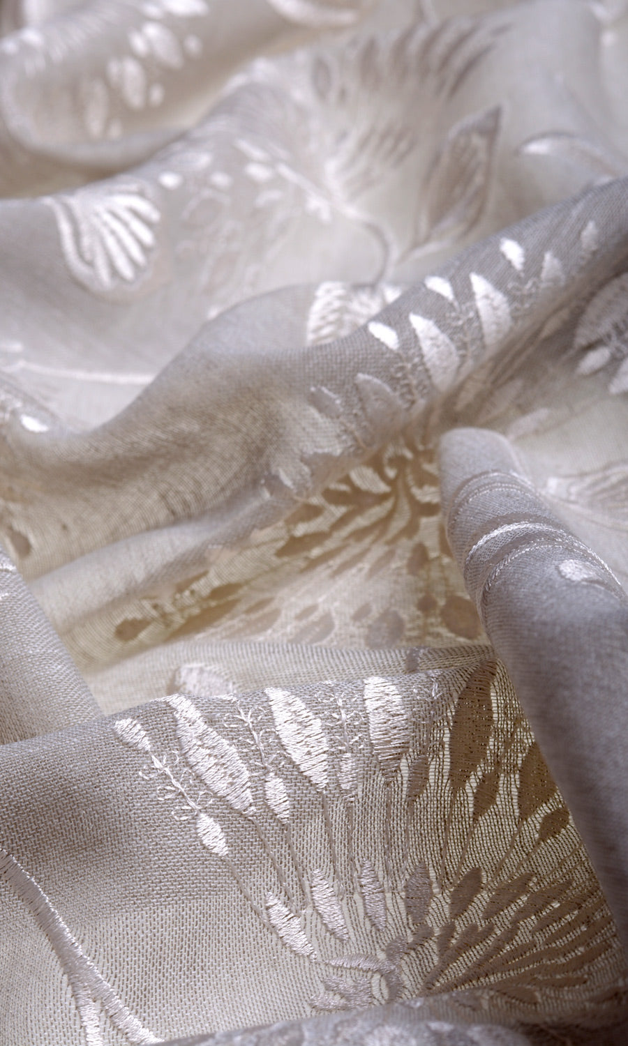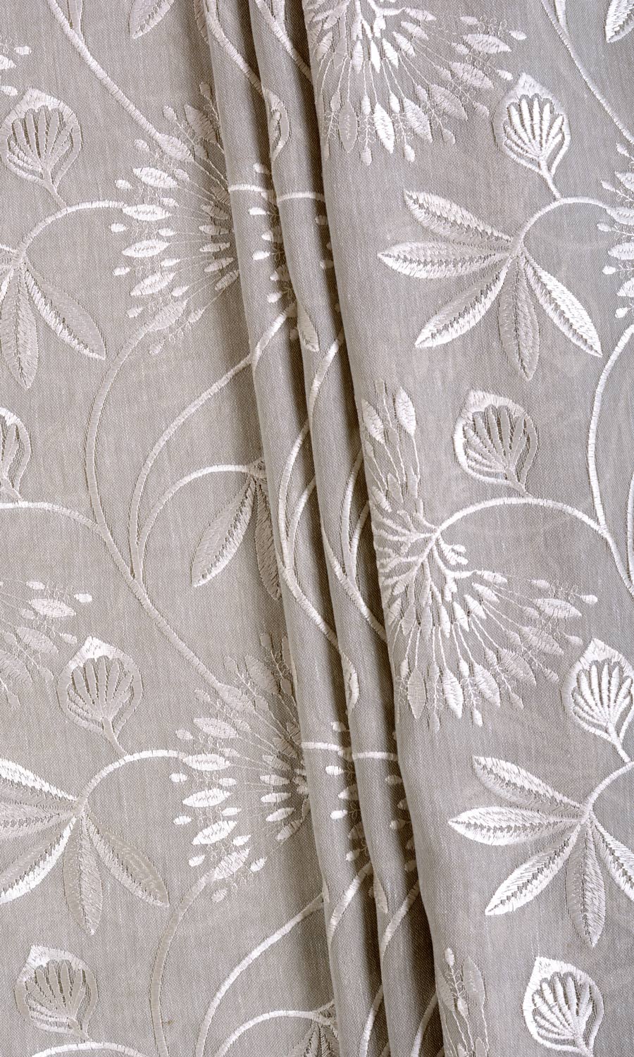 A semi-sheer fabric in warm gray with a wonderfully translucent look for a filtered light effect. It is embroidered in white with a delicate vine pattern with elaborate frond look flowers and leaf motifs. Fondue is just the drapery fabric for a room that spells sheer class.