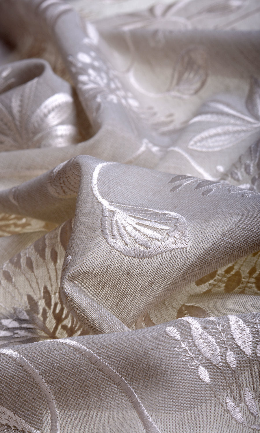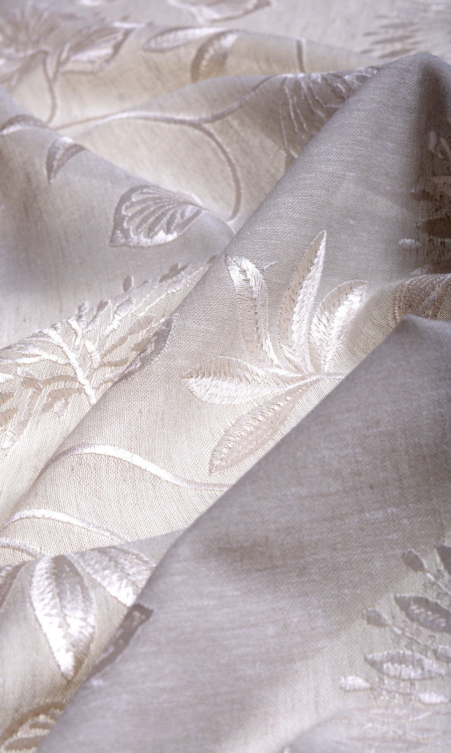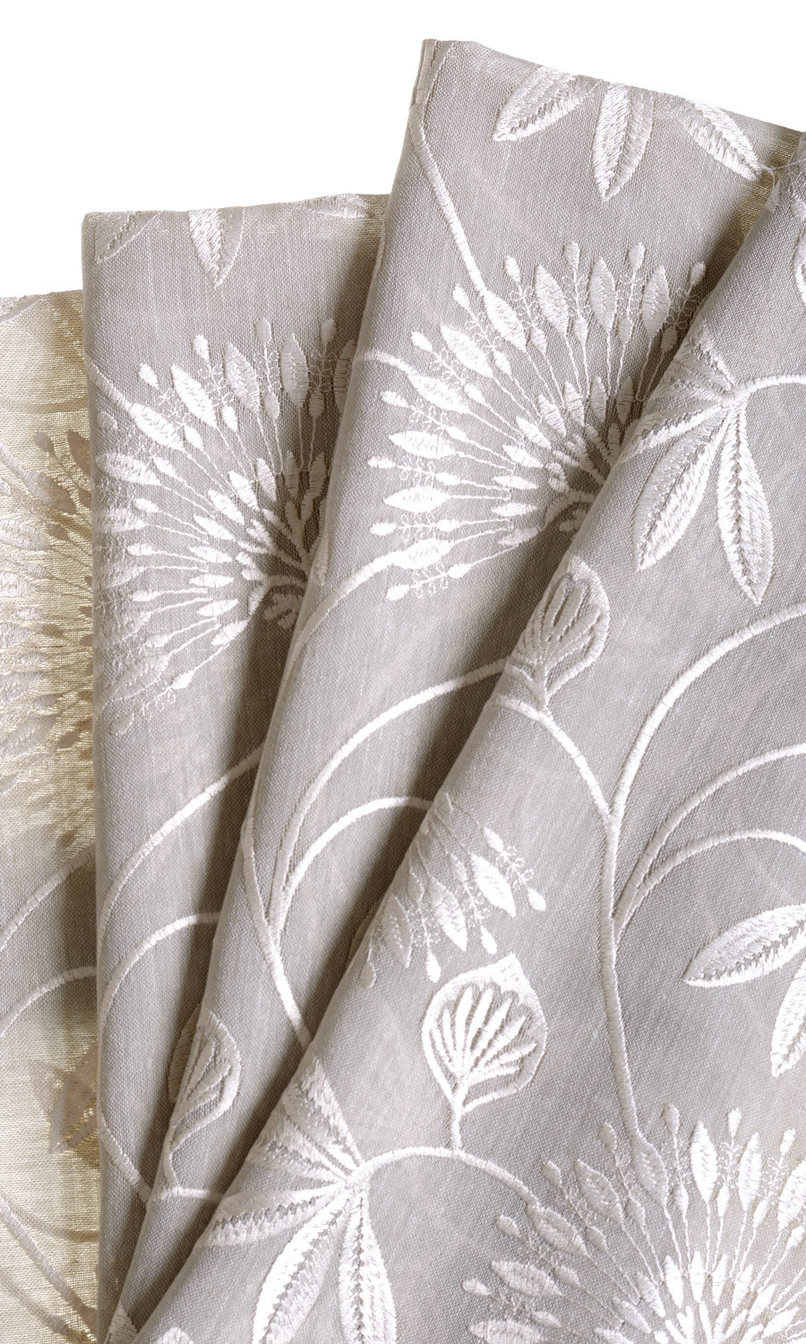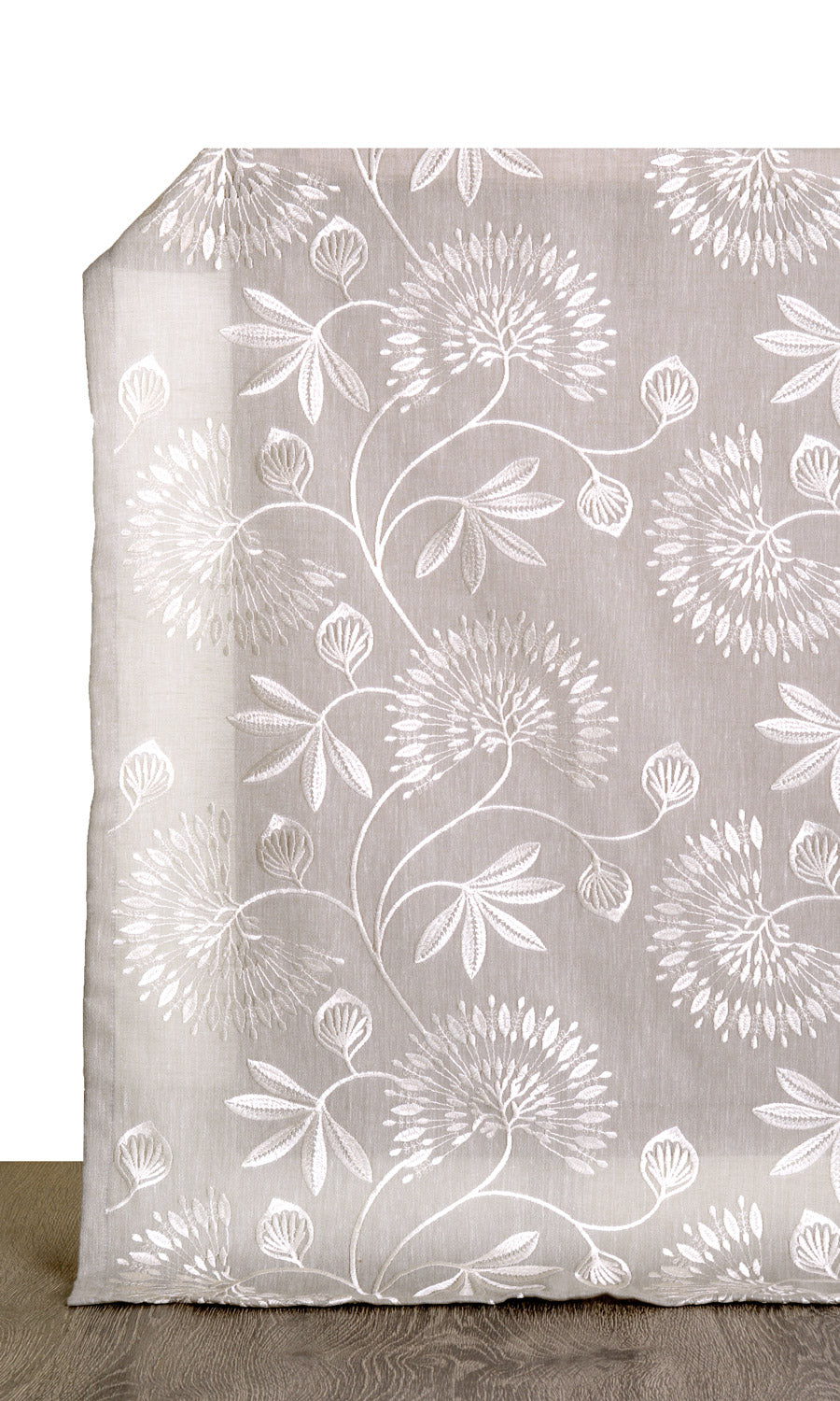 A semi-sheer fabric in warm gray with a wonderfully translucent look for a filtered light effect. It is embroidered in white with a delicate vine pattern with elaborate frond look flowers and leaf motifs. Fondue is just the drapery fabric for a room that spells sheer class.