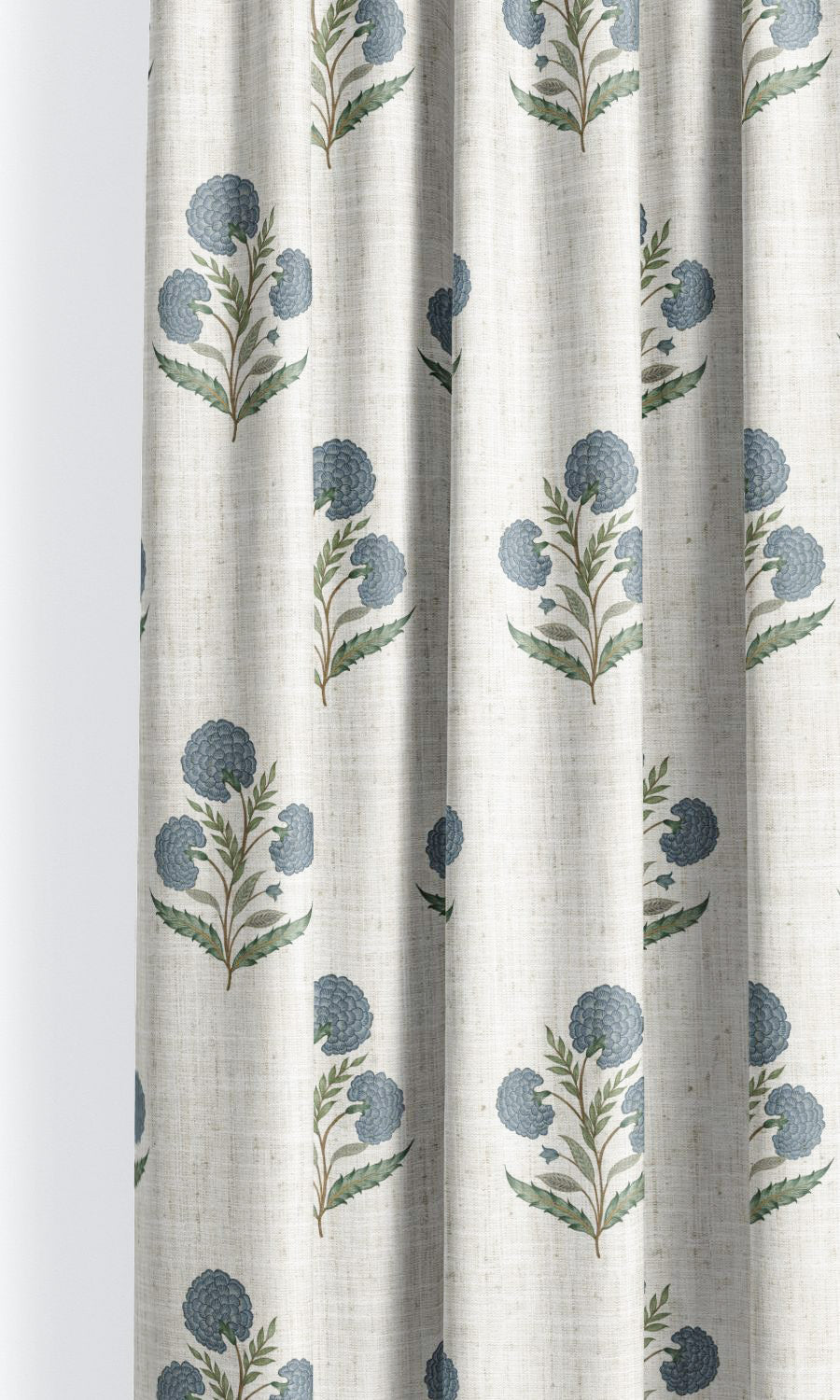 - Deep blue and green unfurl on linen-textured cream, bringing cozy cottage warmth to every sunlit window
