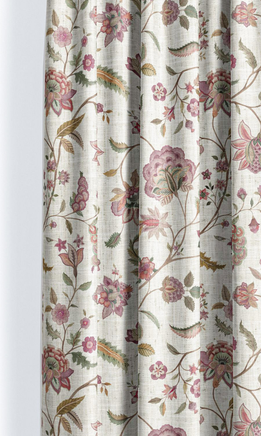 - Choose pinch pleat style: Style Garnet Blossom Jacobean floral curtains with pinch pleat headers, in an elegant blend of rustic charm and formal elegance. The even folds and embellished contours of pinch pleat curtains bring structure and symmetry, anchoring the space in old-world elegance.