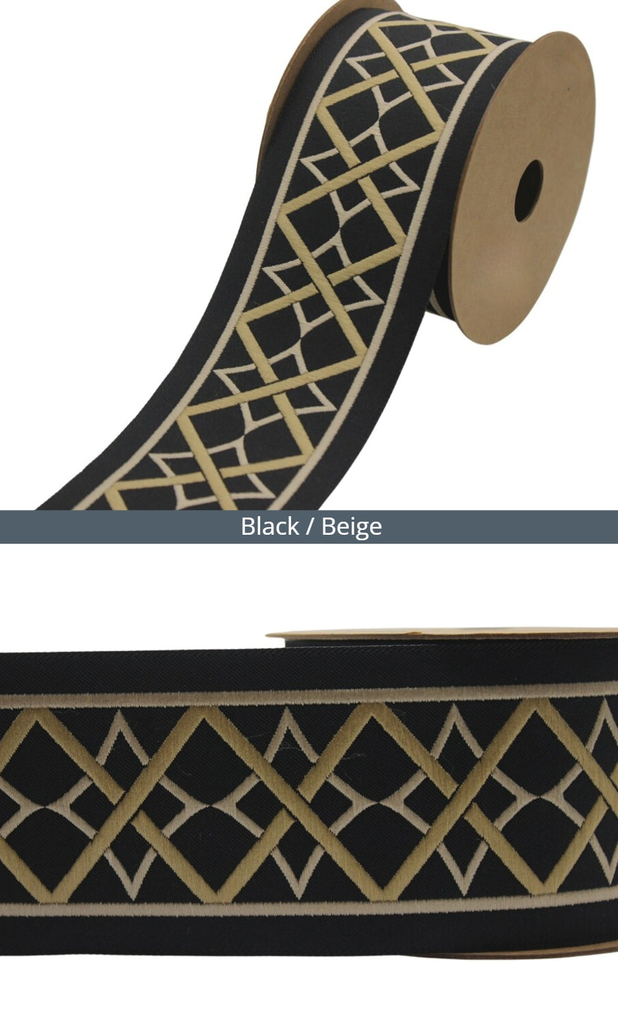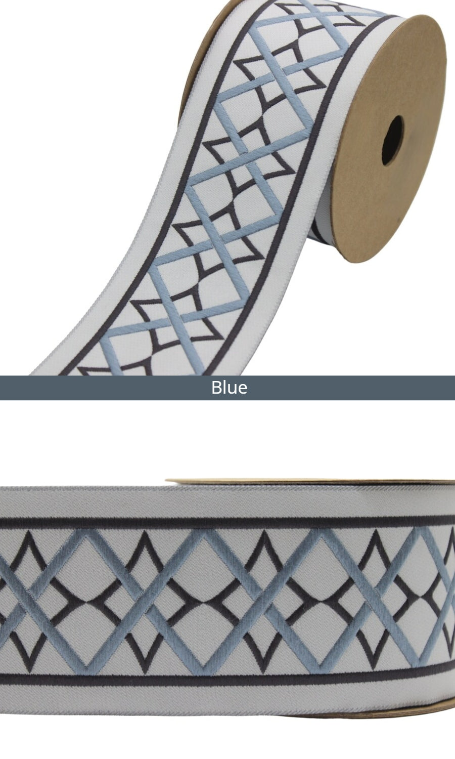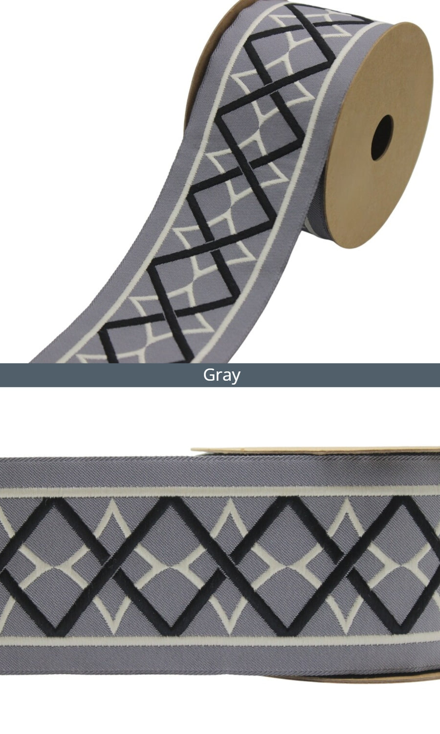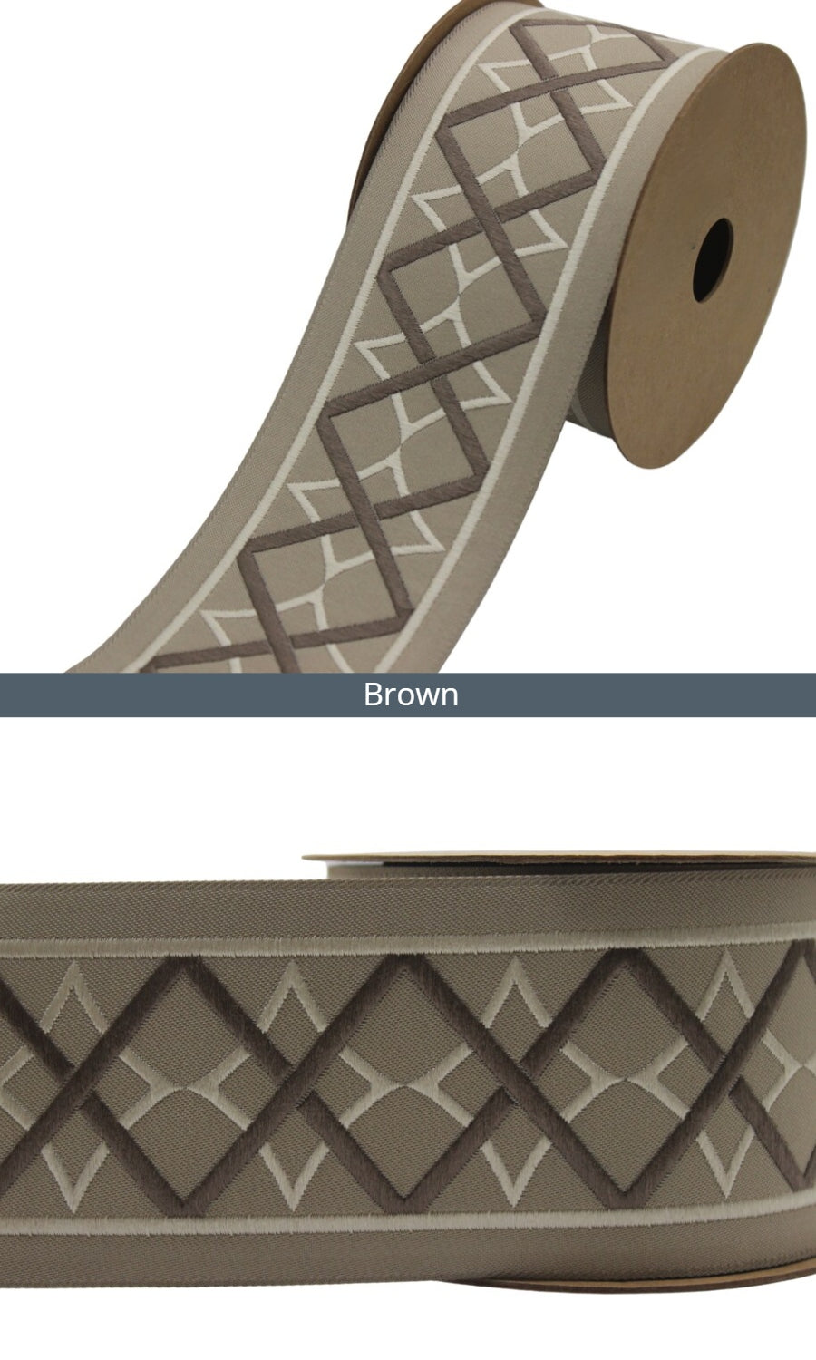 Dress up your custom curtains with ribbon band trims featuring a geometric embroidery pattern in 10 colorways.