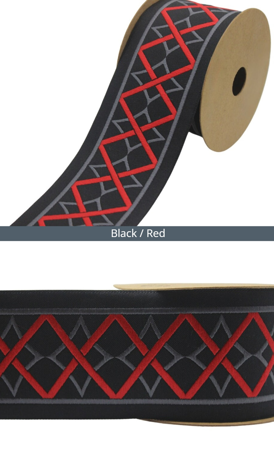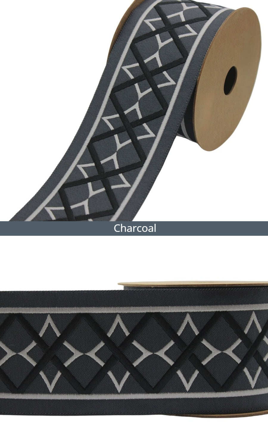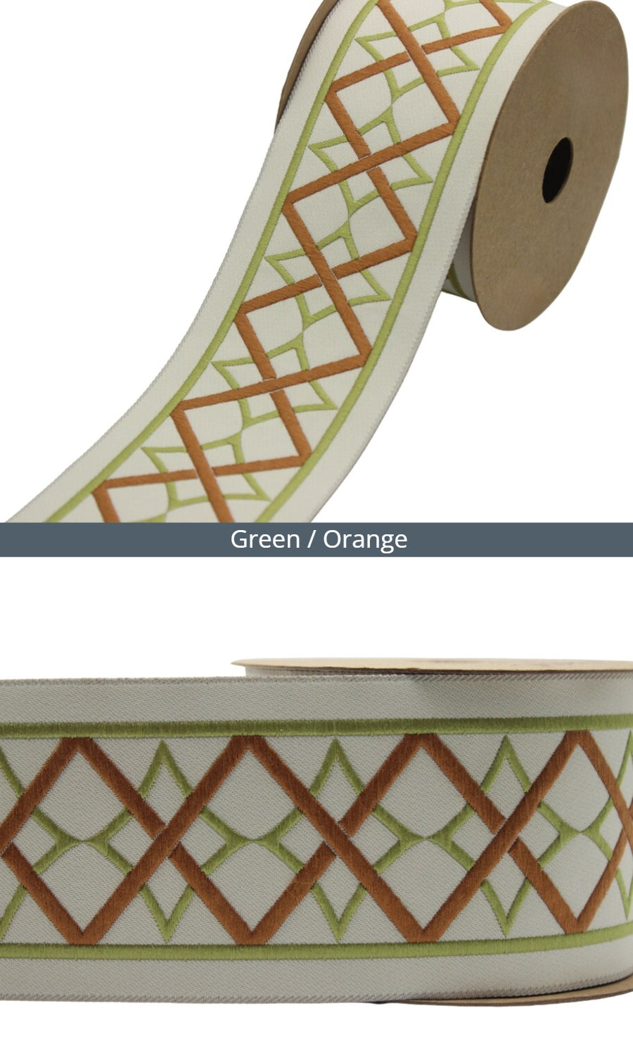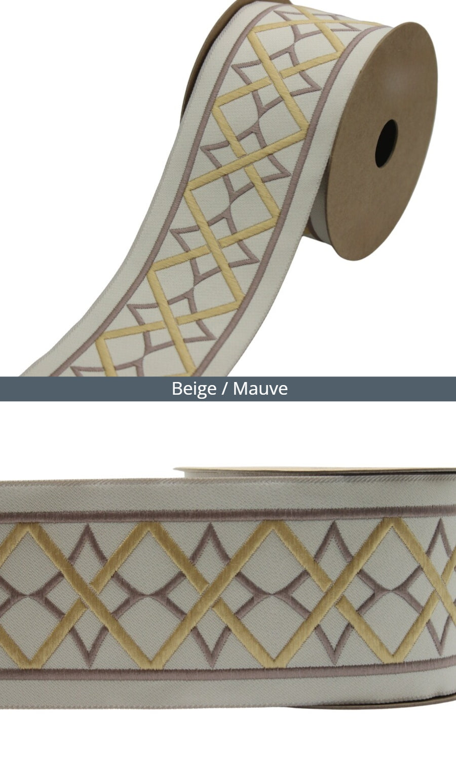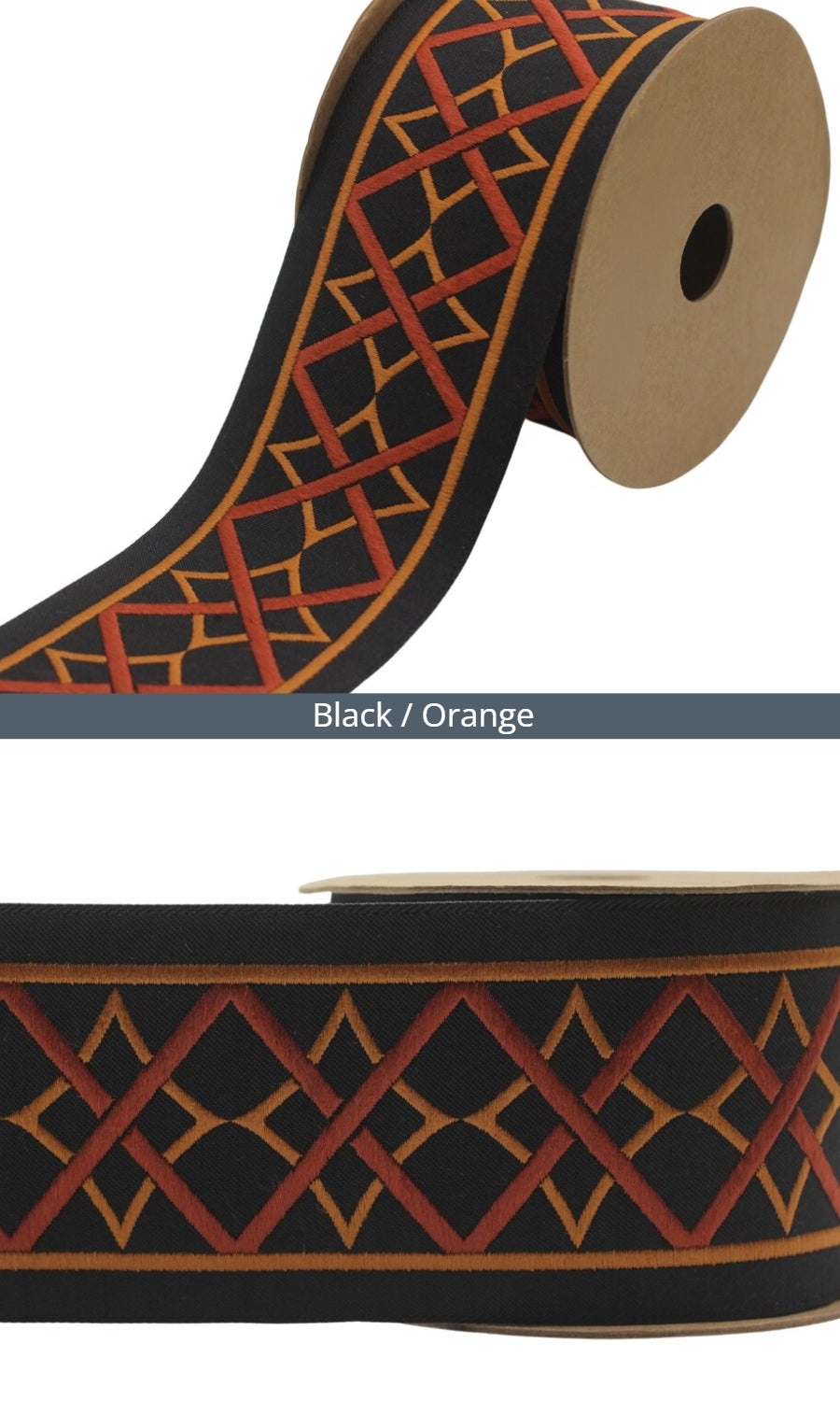 Dress up your custom curtains with ribbon band trims featuring a geometric embroidery pattern in 10 colorways.