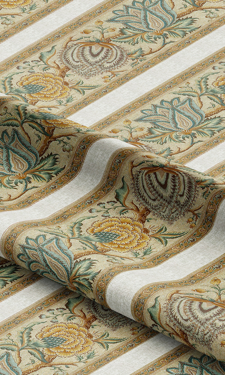 • Its Jacobean floral stripes, where rows of stylized florals are framed by slender stripes, balancing organic softness with sharp geometry