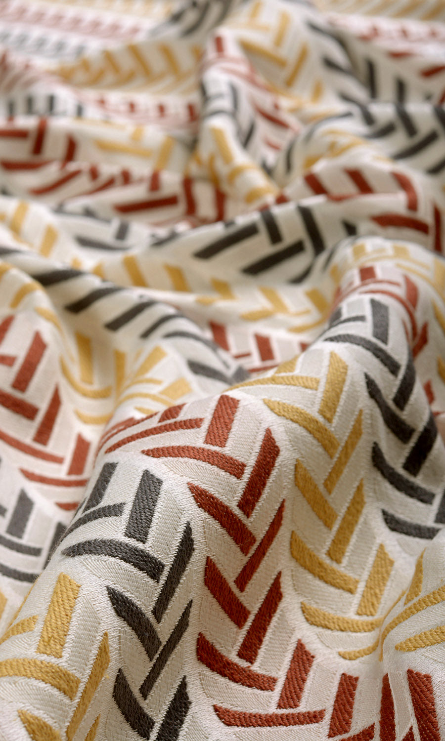 Gilded Empress celebrates symmetry and harmony with its vibrant color palette and horizontal herringbone design. Its white base is patterned with columns of herringbone zigzags in deep yellow, red and charcoal grey. This simple yet stunning fabric can visually elongate your windows. We recommend it for draperies or roman blinds for a clutter-free space.