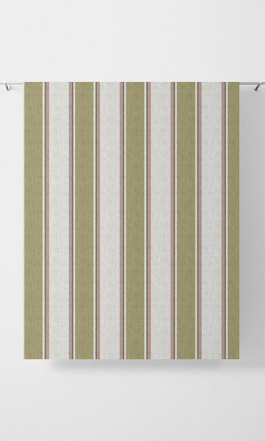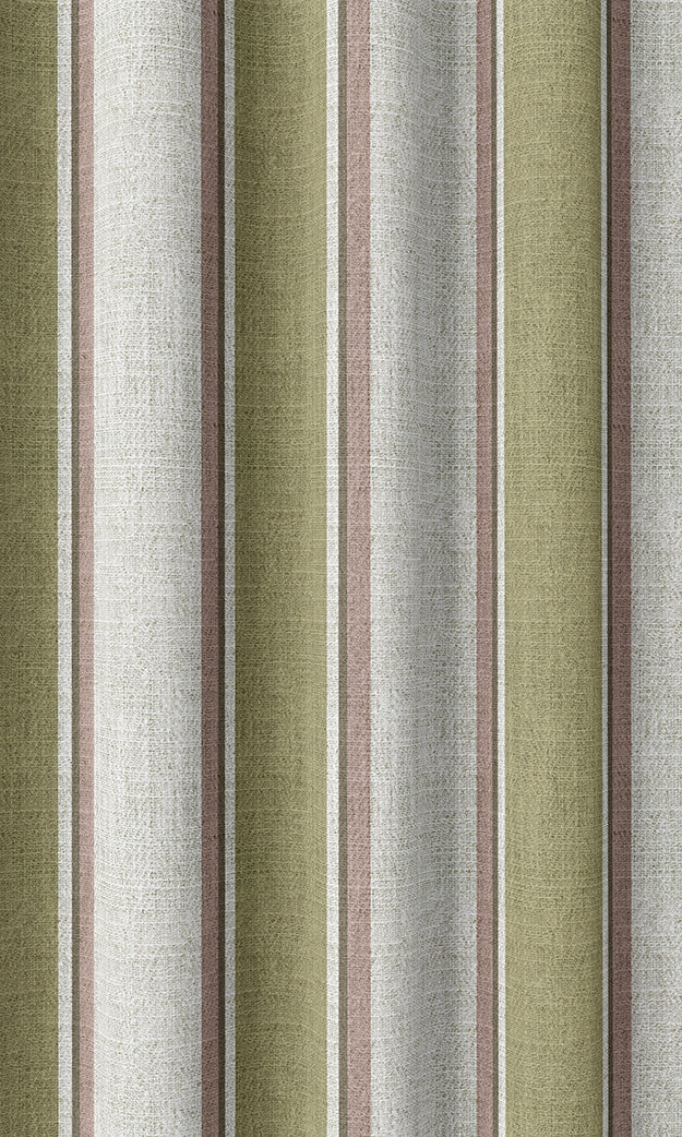 Designed with classic regency stripes in an appealing color scheme of olive green, mauve pink and white, this fabric breathes simplicity and country vibes. The attention-raking scale of the pattern is supplemented by an impressively attractive palette. Elongate your space with elegant drapes and shades in this vertical striped fabric which can easily blend with any decor style.