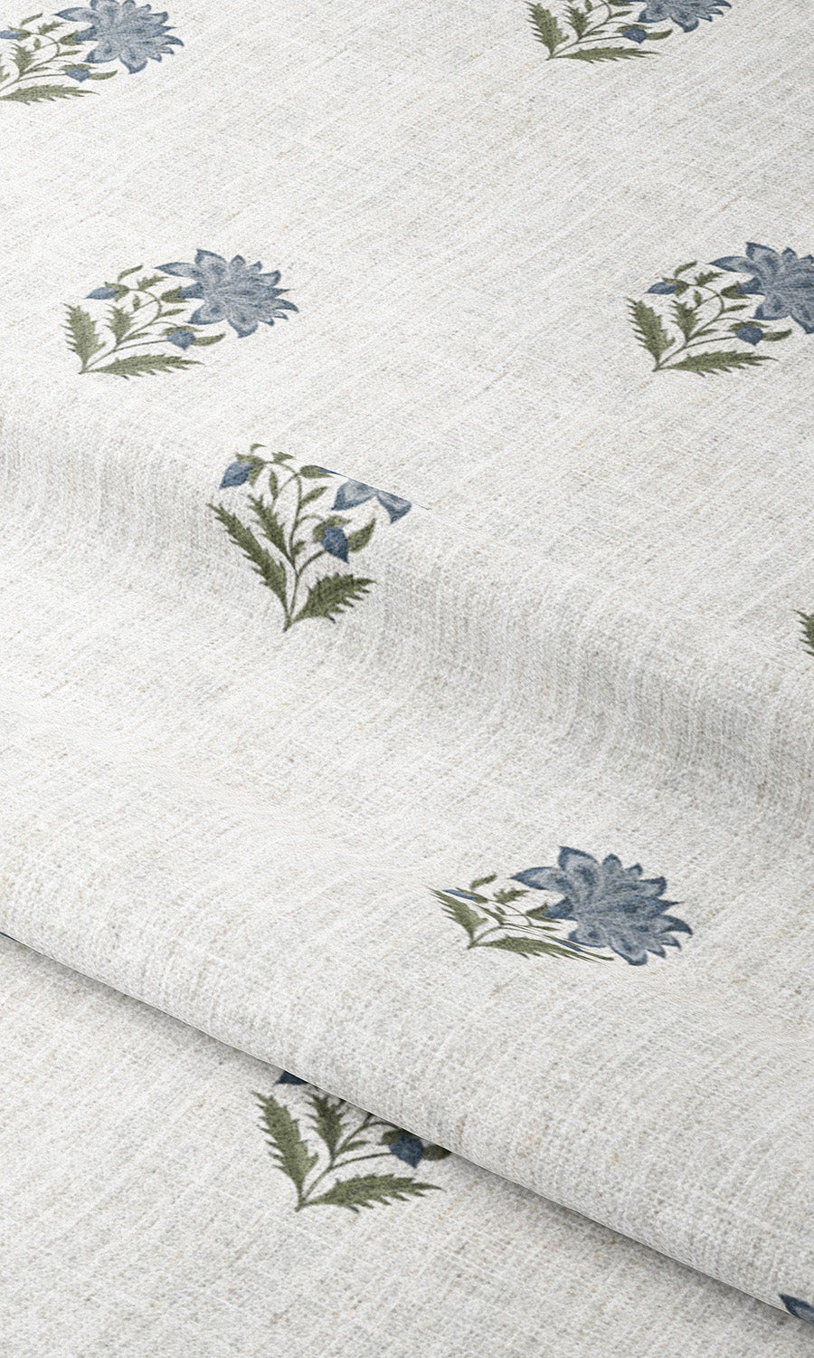 • Stone blue and olive green paint a floral tableau on serene cream, evoking soft, timeless elegance