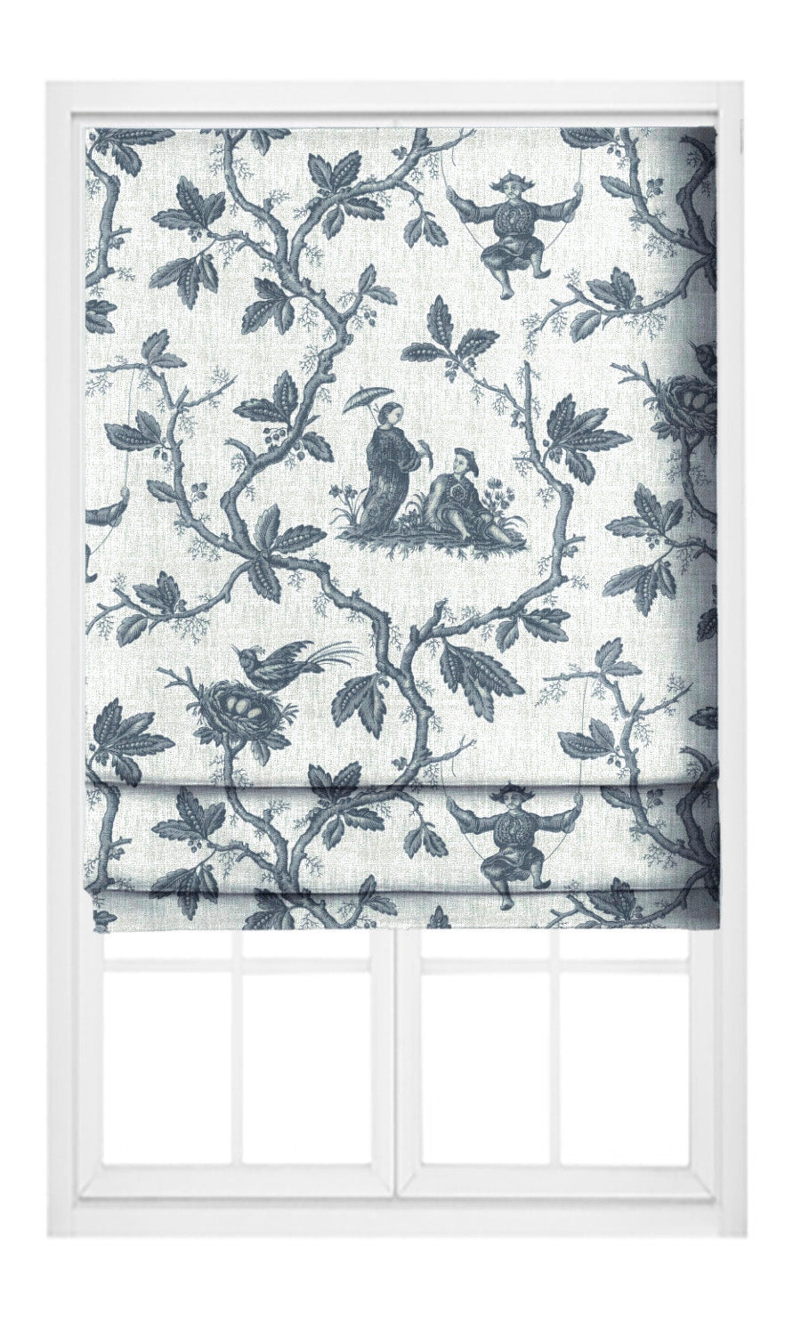 - Coordinate for bespoke appeal: Consider ordering this blue toile fabric by the yard to upholster an accent chair or headboard, to coordinate with your roman shades. This thoughtful touch not only reinforces the pastoral theme but also showcases the bespoke detailing woven into your decor.