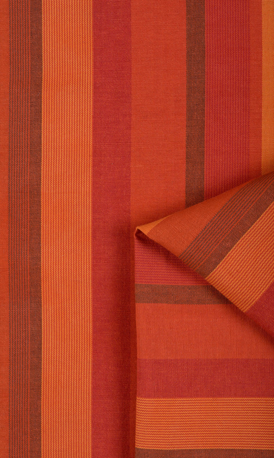 A vibrant fabric with geometric stripes of deep red and orange. Filled with rich textural interest and bright flamy hues, this one will have your windows looking tres belle in no time! Add to a color-filled home or an eccentric space to load it with autumnal flavor and an exotic touch.