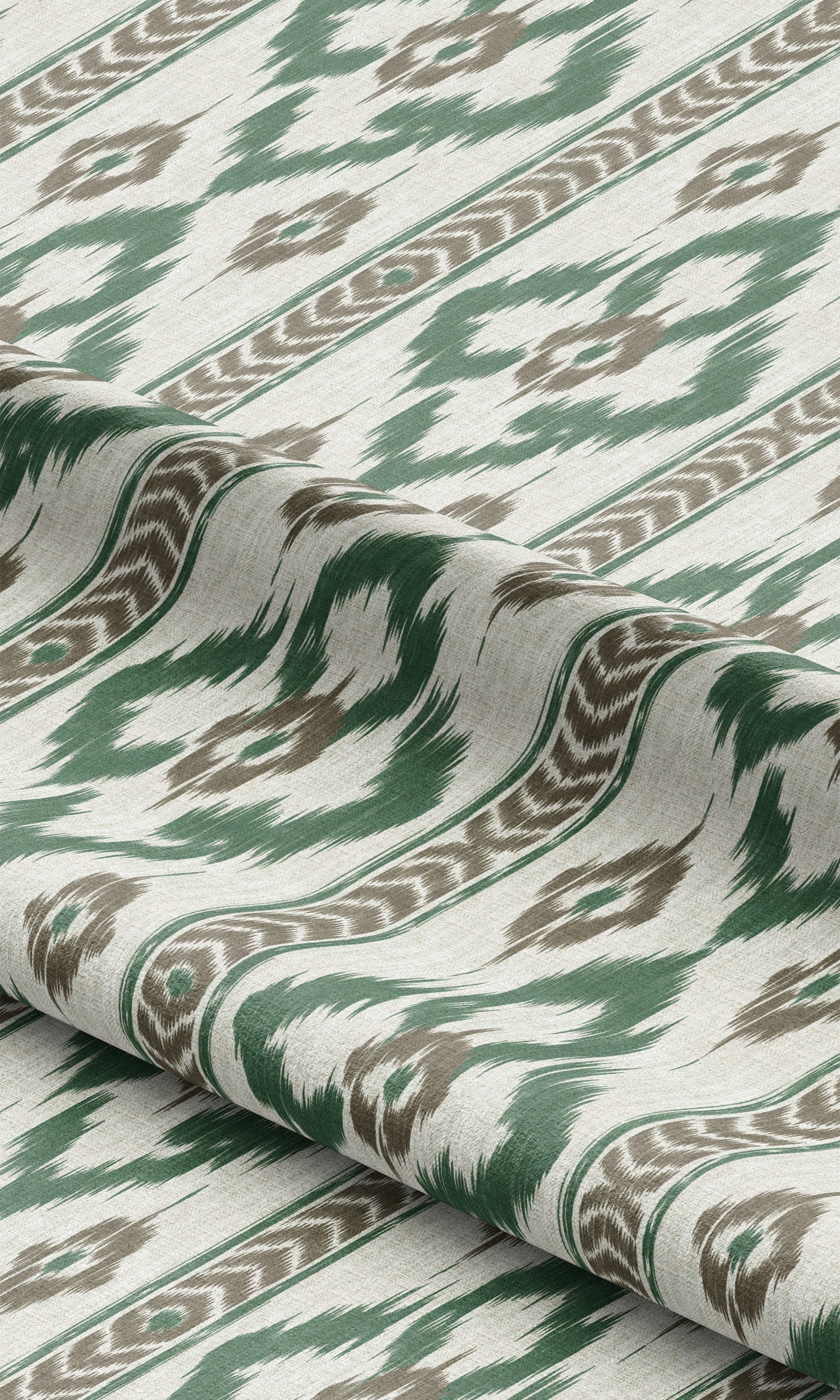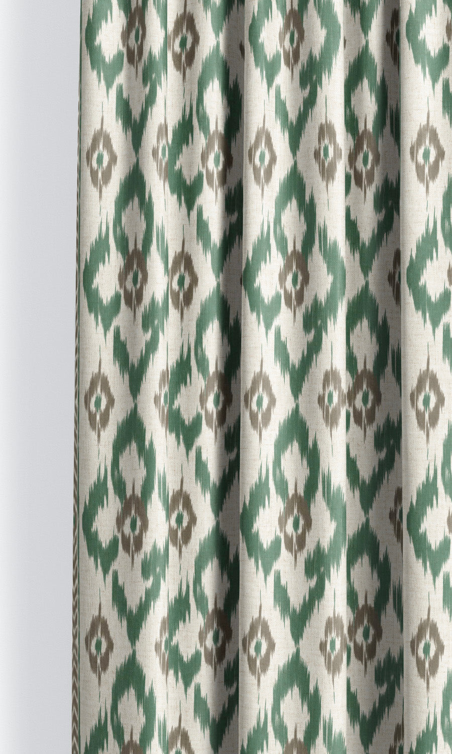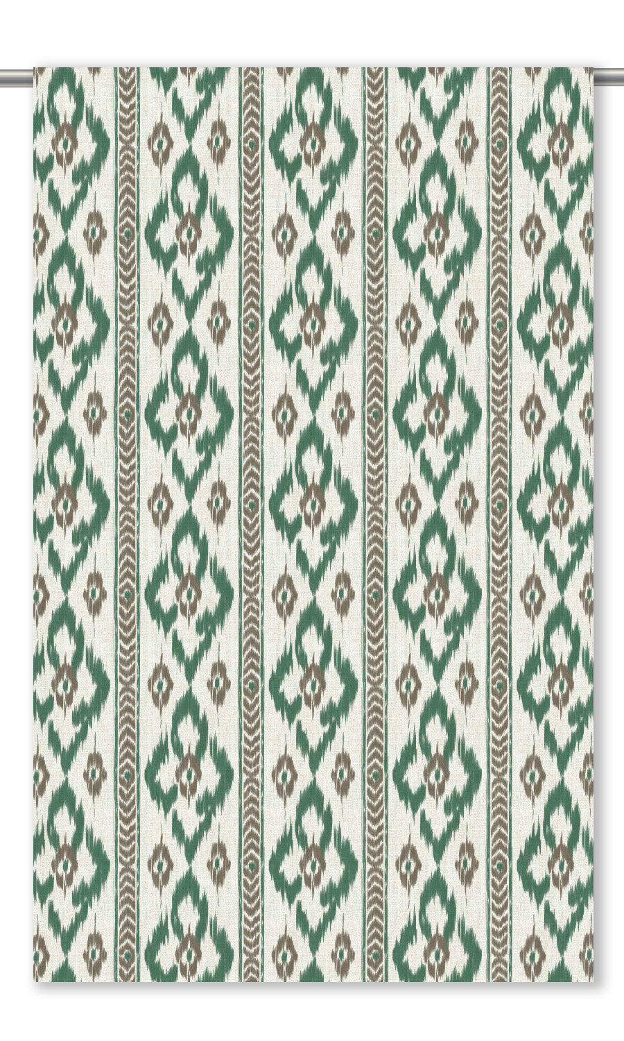 Its ikat geometric pattern where elaborate geometrics, interwoven with vertical stripes, and softened with blurred silhouettes, add depth and movement to the decor
