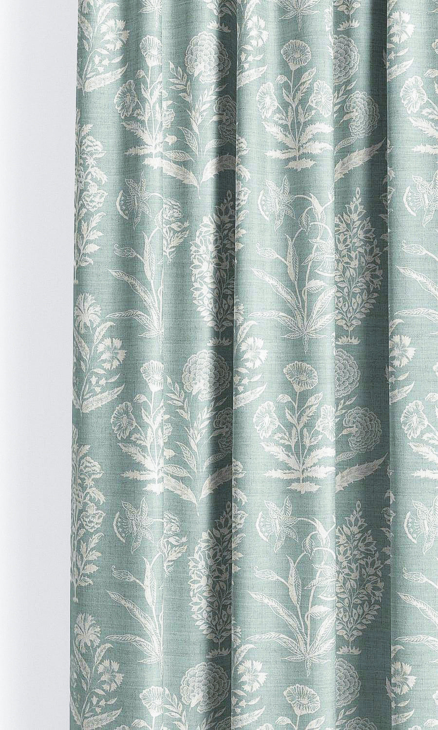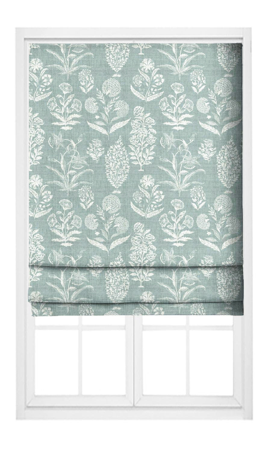 - Frame with white panels: Layer Himalayan Poppy powder blue floral roman shades with plain white curtains to create a coordinated color story. The curtains enable the pattern to stand out while improving insulation and light control.
