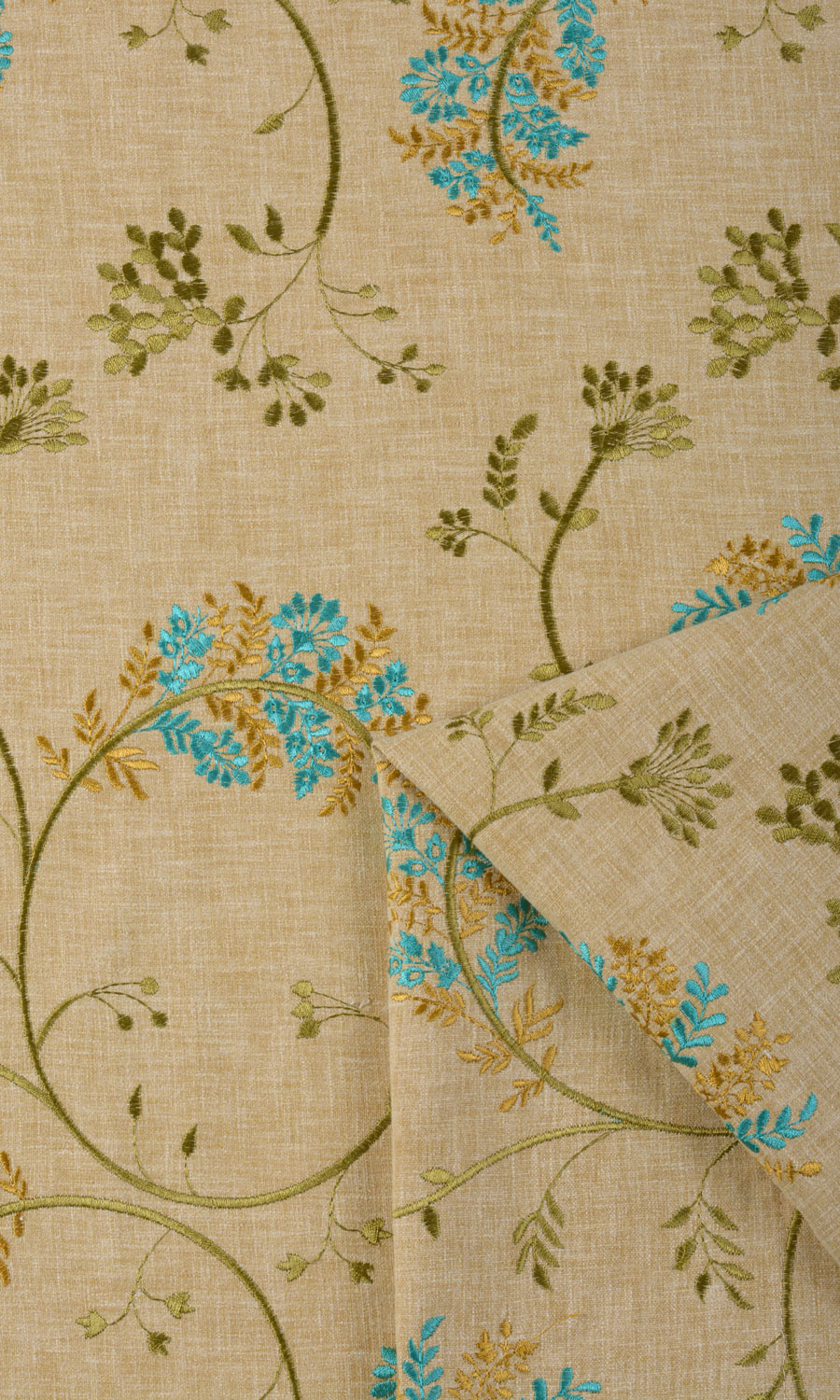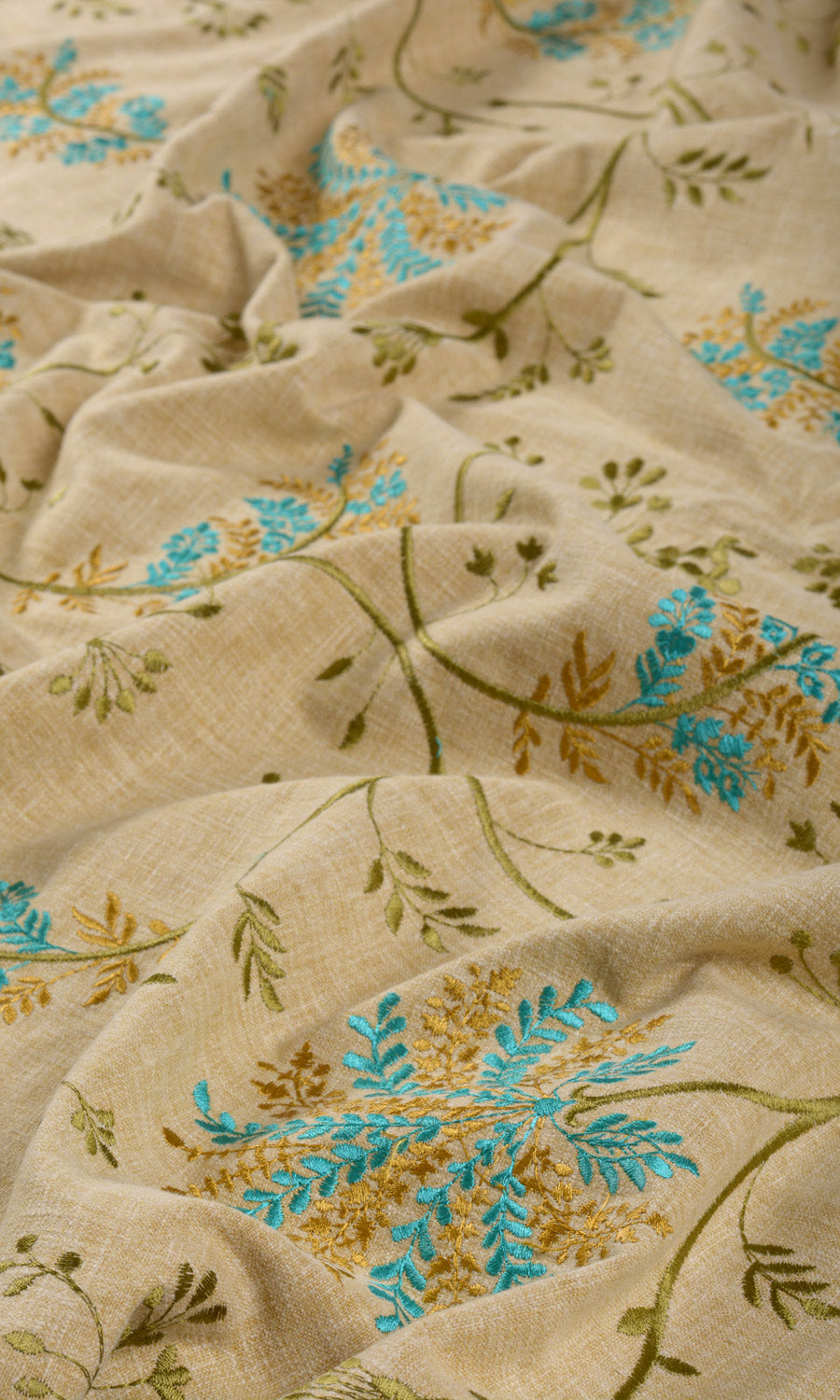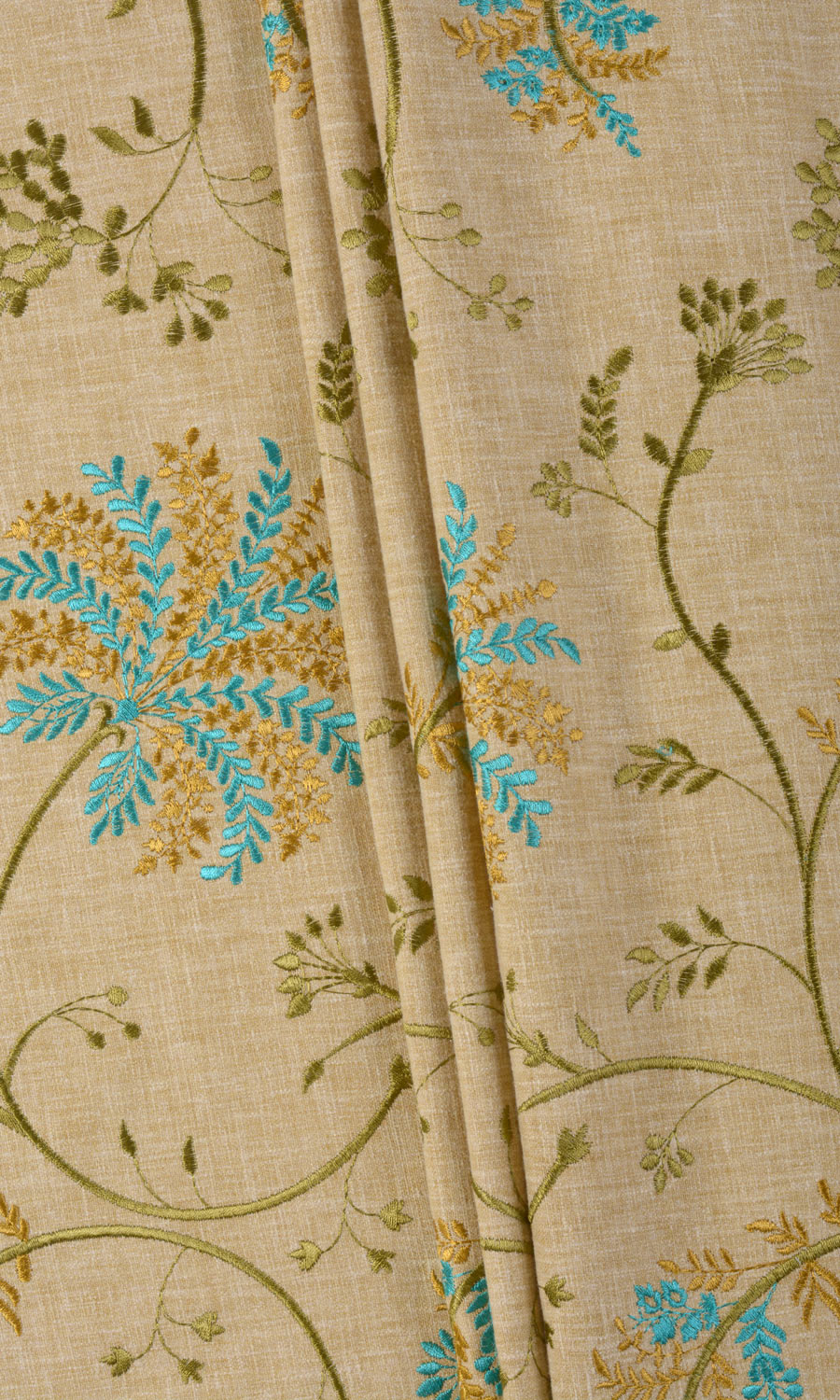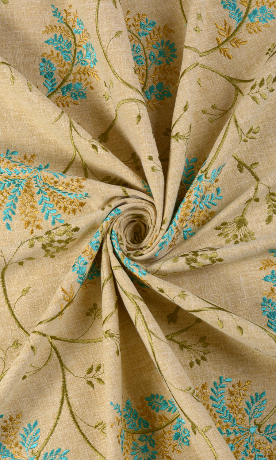 If fairyland had enchanted forests, they would look something like Iced Teal. This fabric is fawn beige is embroidered with a leafy floral pattern in mustard brown, olive green and turquoise blue. Dreamy in feel and lovely in look, this is the drape for a gentle, feminine space. The base fabric is a blend of cotton, polyester and viscose, for lasting durability and smooth drape.