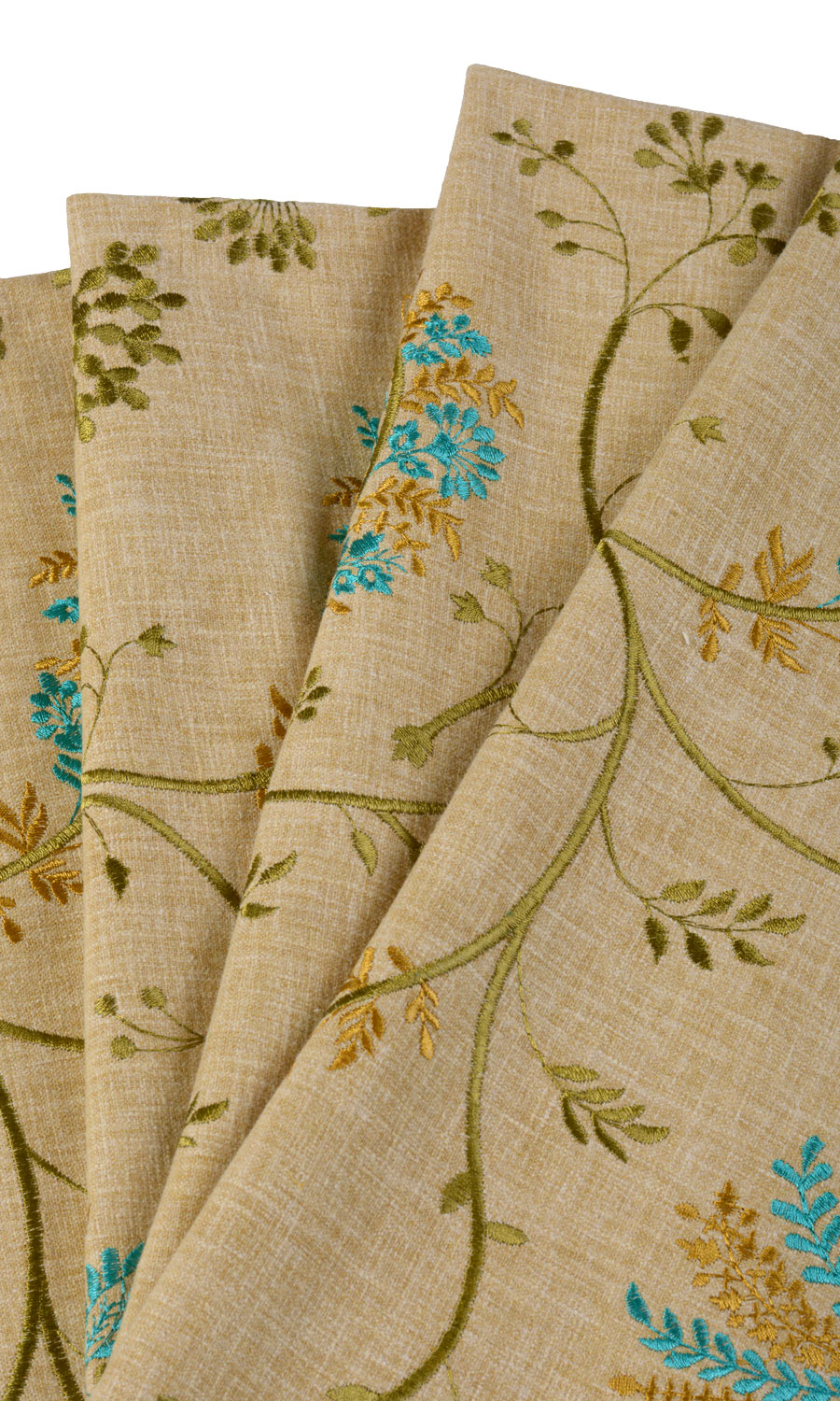 If fairyland had enchanted forests, they would look something like Iced Teal. This fabric is fawn beige is embroidered with a leafy floral pattern in mustard brown, olive green and turquoise blue. Dreamy in feel and lovely in look, this is the drape for a gentle, feminine space. The base fabric is a blend of cotton, polyester and viscose, for lasting durability and smooth drape.