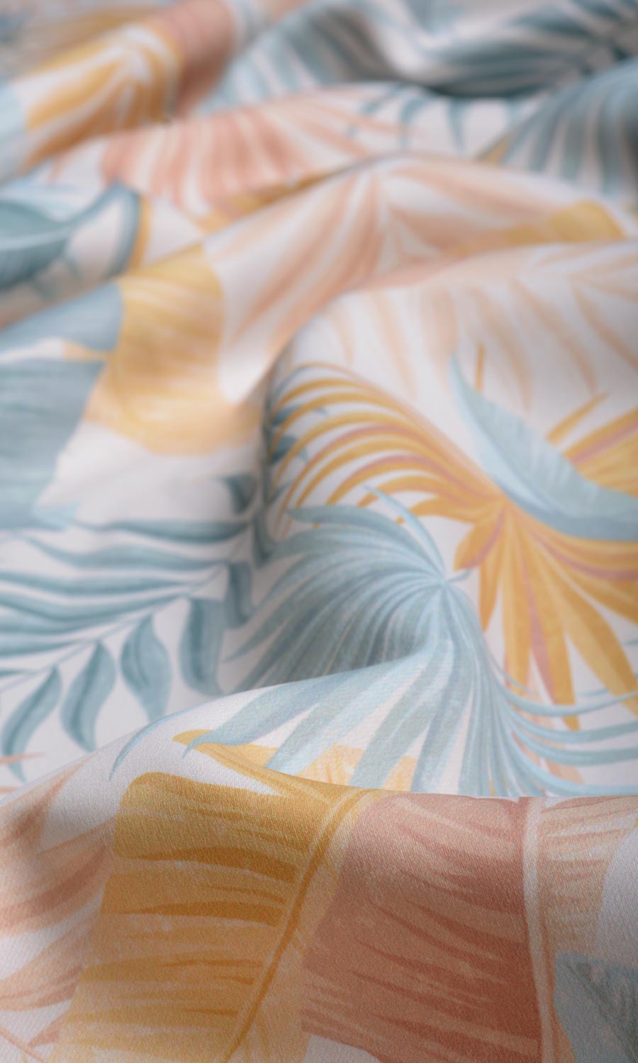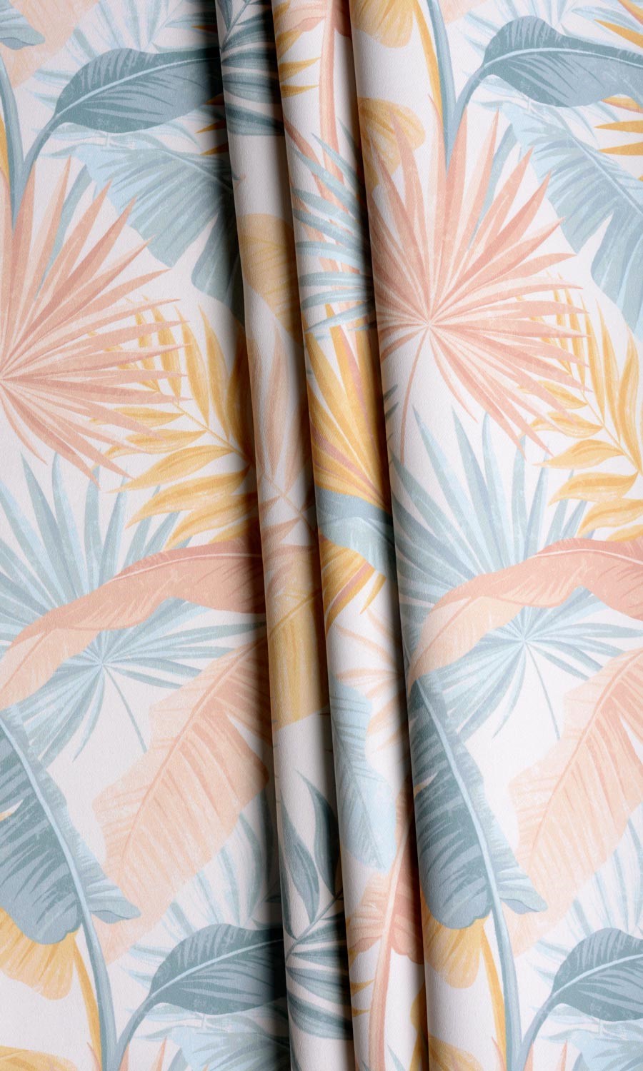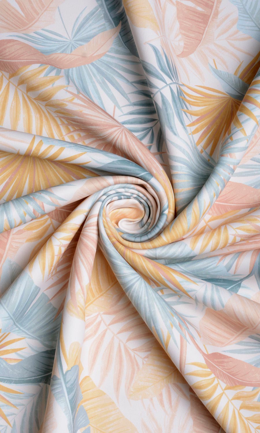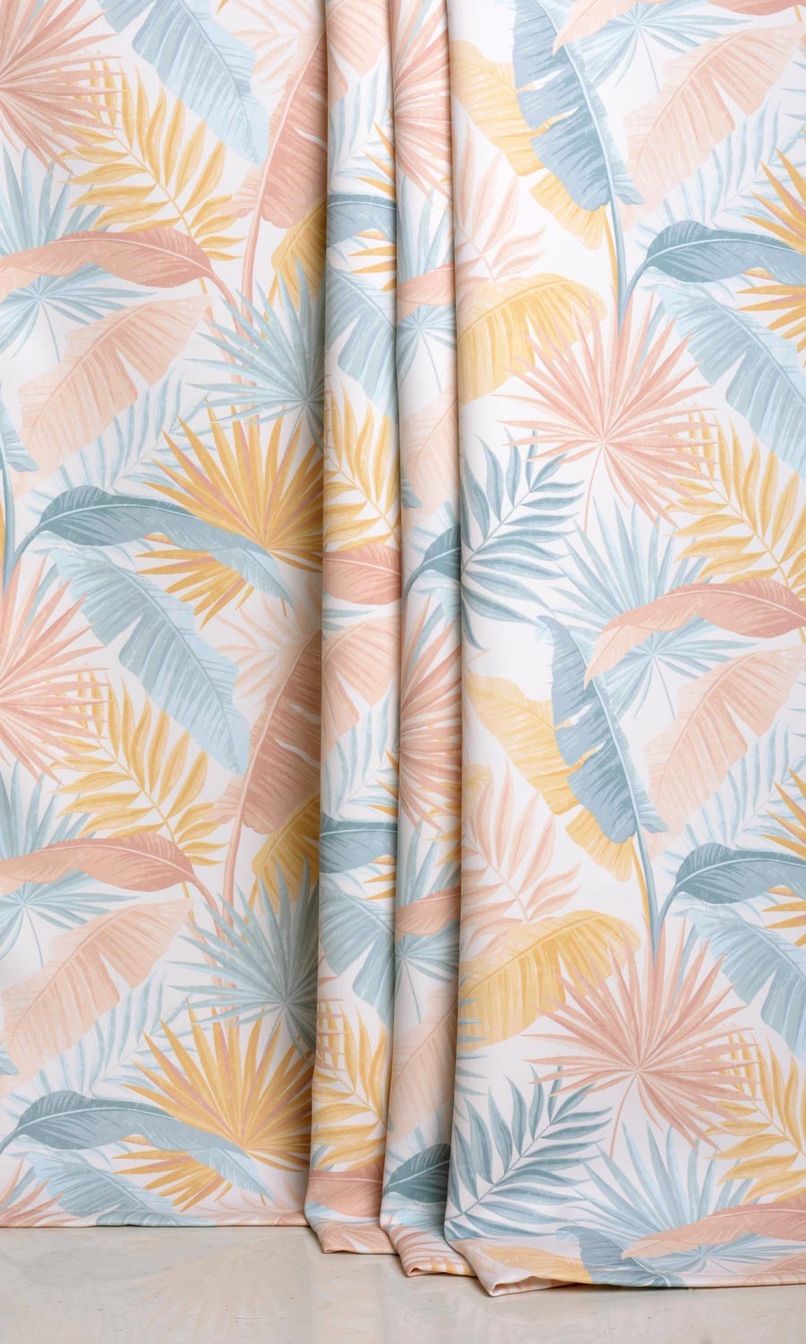 Tropical foliage in sunny hues - a vibrant fabric that celebrates the sublime beauty of nature unabashedly in urban terrain! Nothing can cheer up the soul as a visual treat of a prosperously teeming verdure; dressing it up in a lively palette simply doubles the impact. Soft pinks, grays and yellows shedding their mojo on a white backdrop make this window treatment a timeless decor element.