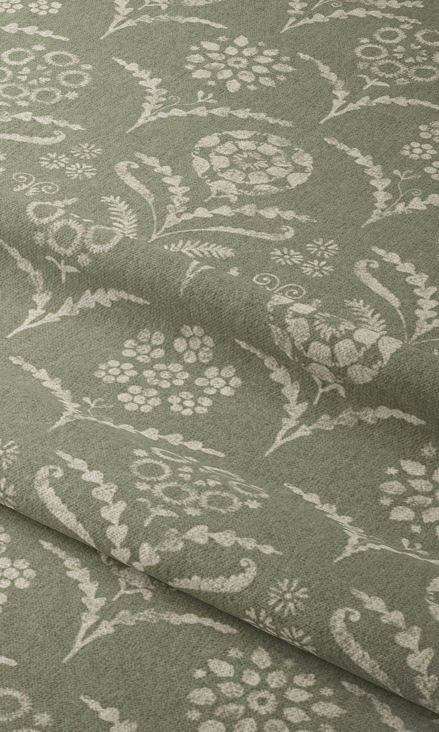 - A palette brimming with warmth and grace, with dewy off-white budding on deep sage green