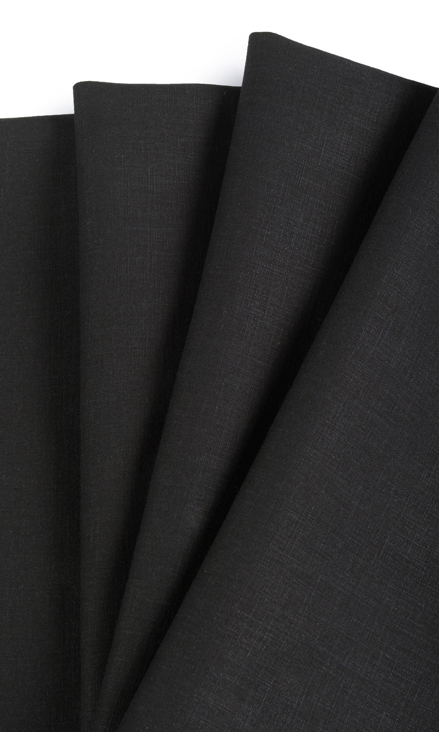 Bring drama with window treatments in this black fabric which beautifully backdrops colors of all kinds besides helping the space feel more enclosing and warm. Fusing both the goodness of natural material and man-made substance, this cotton-blend window dressing controls light and heat efficaciously. Our stylists recommend pinch pleat drapes and front-slatted roman shades for this monochrome beauty.