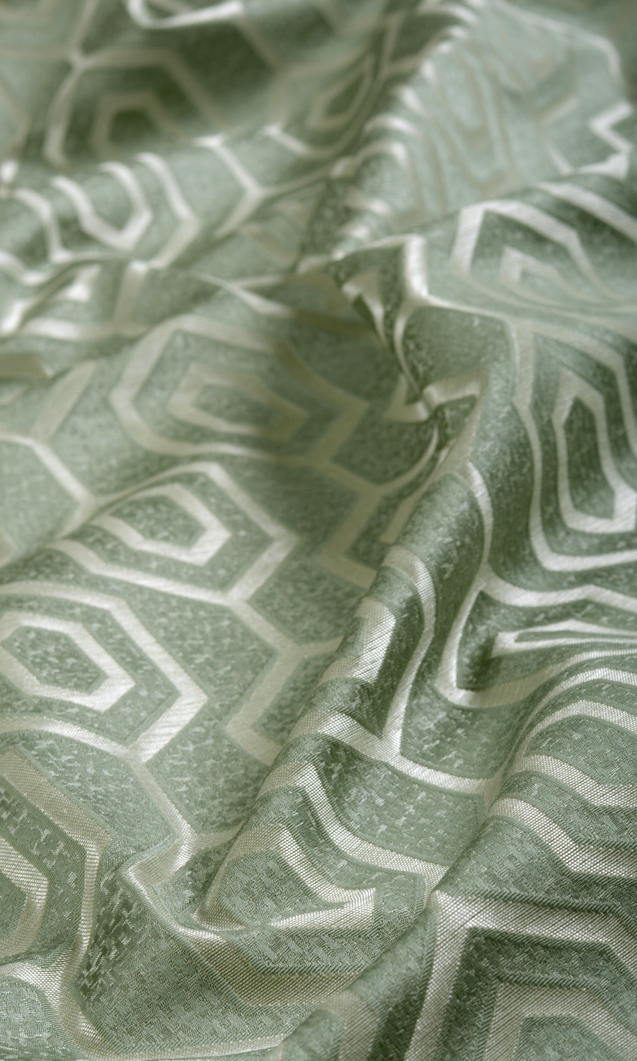 Jacquard in honeycomb pattern. Its color is a soft and gentle sage green, very restful to eyes. The geometric design elements and the smooth finish give Laurel Spruce a class of its own. We recommend this fabric for interiors where you put your feet up and relax.