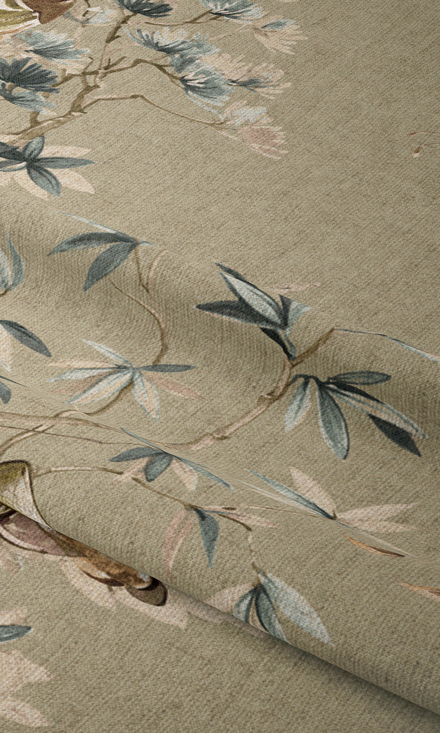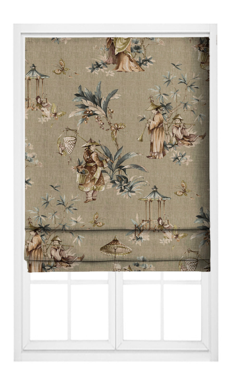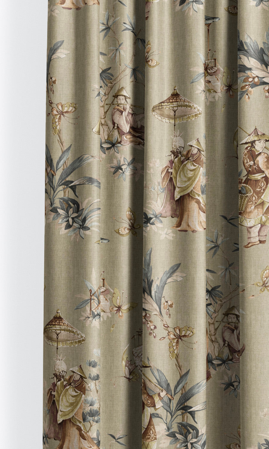 Its charming chinoiserie print depicting delicate vignettes of life and labor, where musicians and harvesters in traditional attire animate a serene Asian landscape