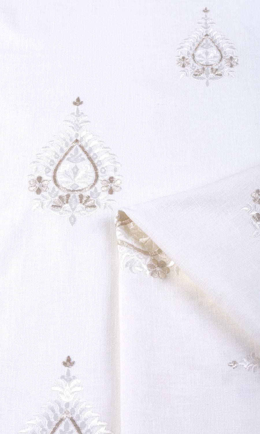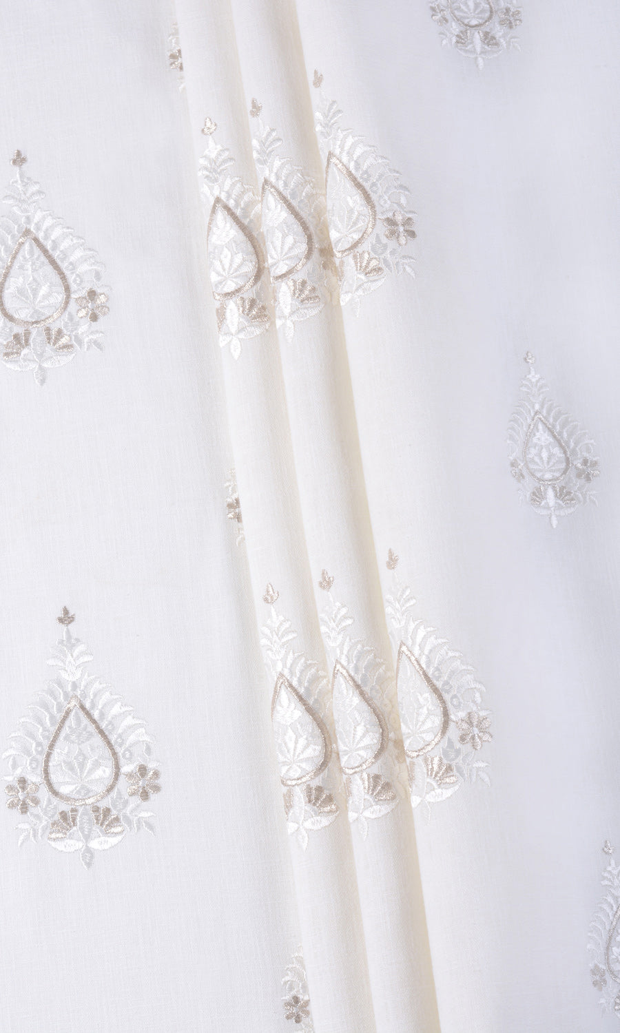 Give your dream interior a silver lining with Liberty, the drapery fabric with distinction. The white base is a blend of cotton, polyester and viscose for a refined look. It is adorned with an elaborate Persian paisley inspired motif in pale and silvery grays. Rich and detailed, this fabric is perfect for formal spaces that need a hint of glow.