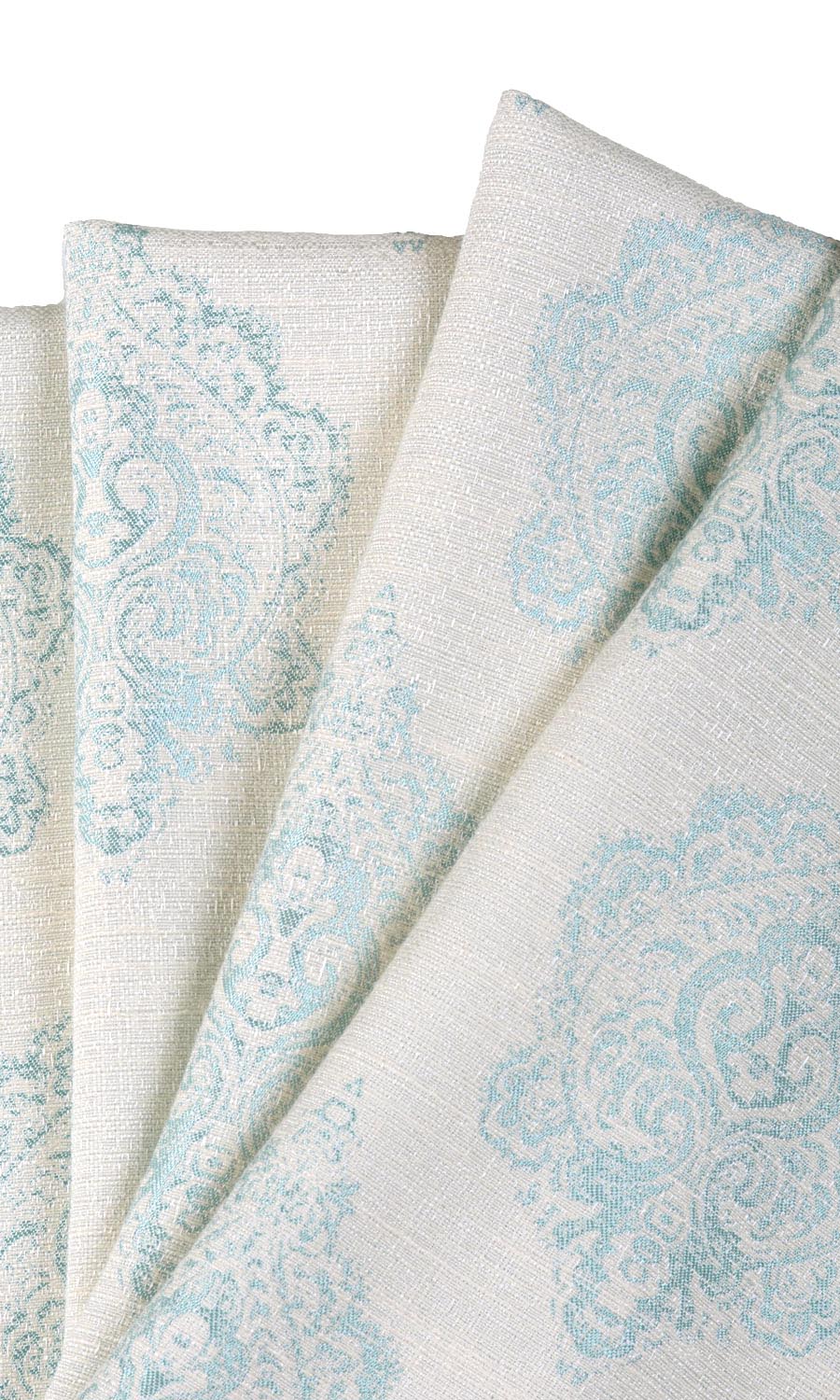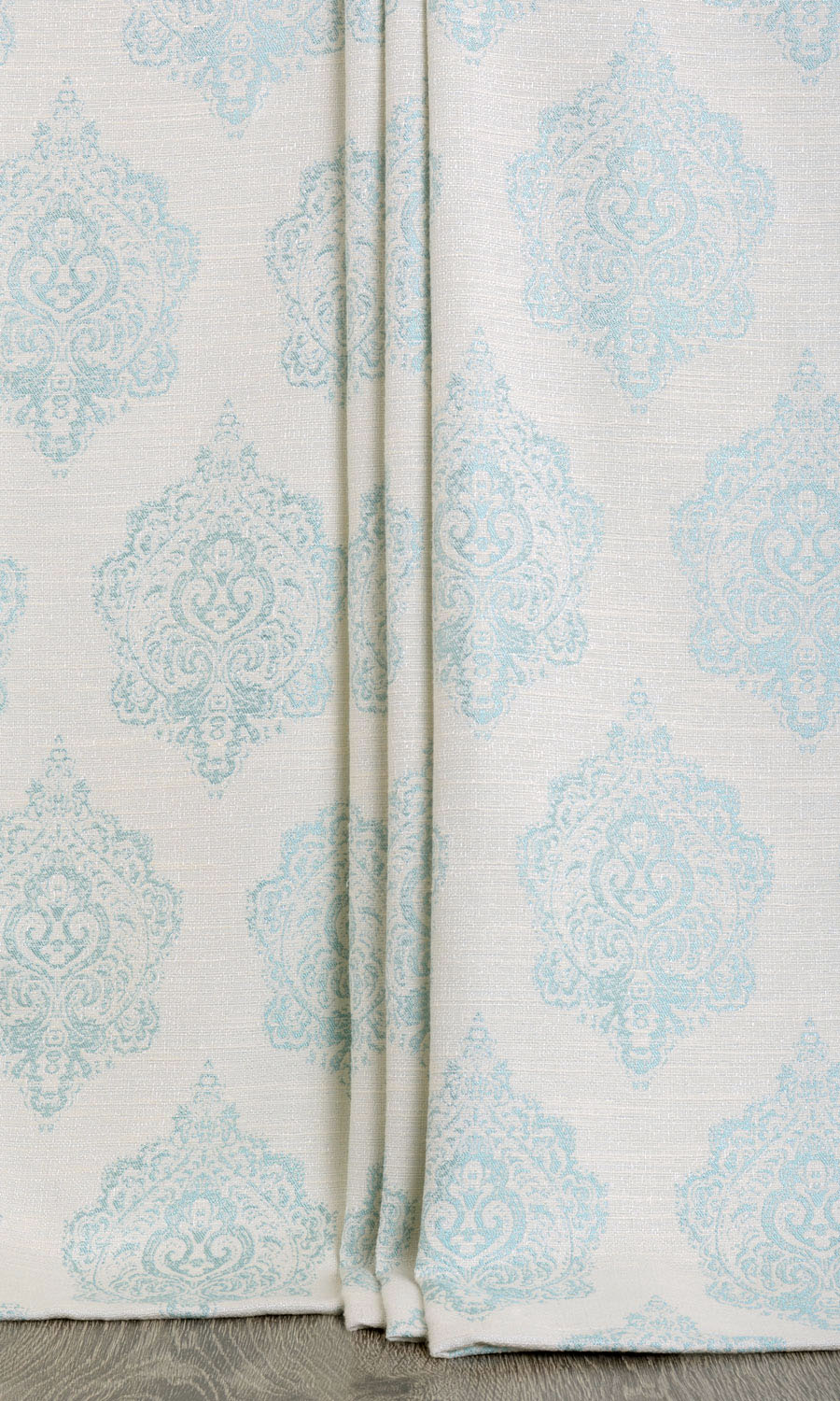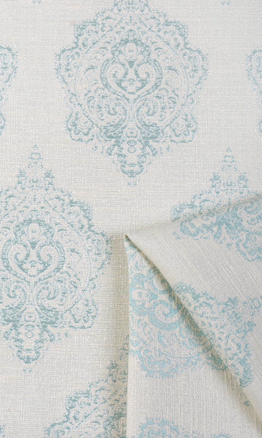If you like traditional jacquard motifs but dislike intense color palettes and overly ornate design elements, Light Splash should appeal to you. This sturdy polycot drapery fabric has an off-white base patterned with a traditional, oversized and stylized botanical motif in a delightful blue. The texturally rich base and the raised pattern look good together; as does the simple no-fuss color combination.
