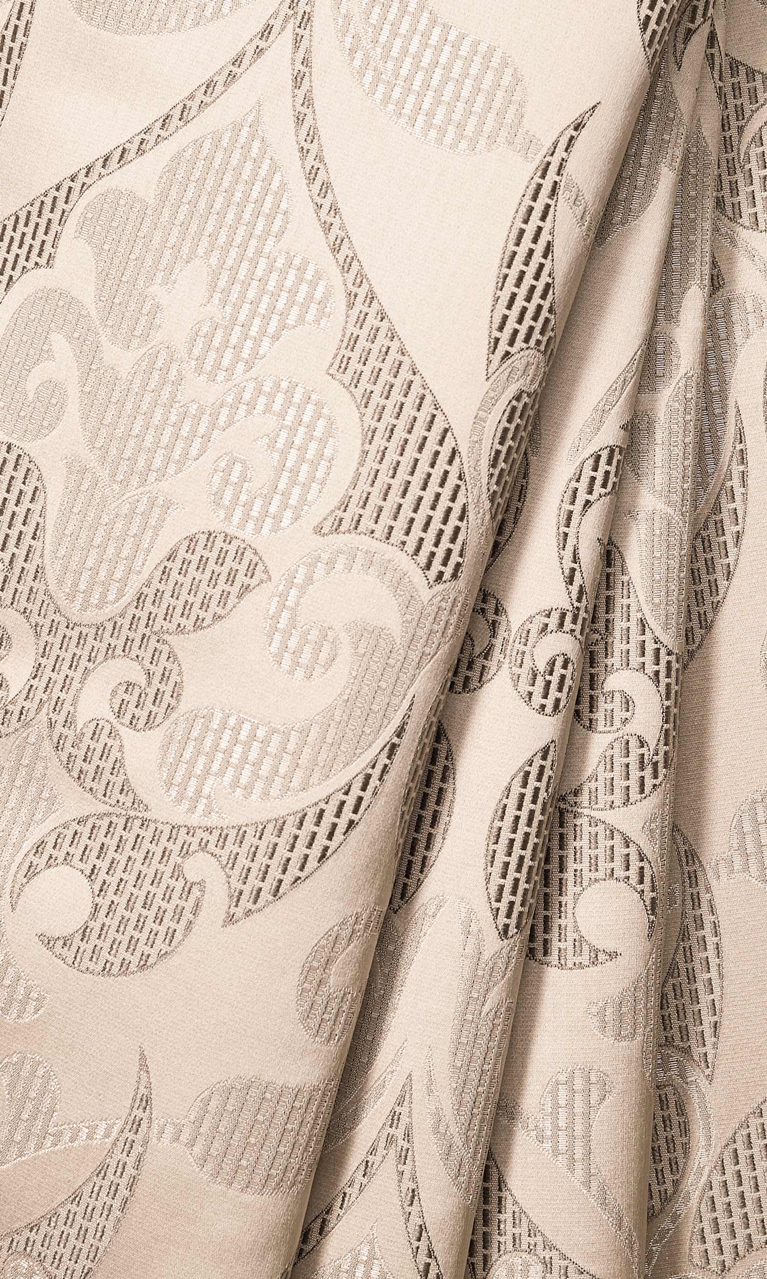 This spectacular self-patterned and embossed fabric comes in a luminous deep beige and champagne gold color combination. The exotic oriental motif, bamboo-look stripe detailing and raised texture effect make Light Tan a curtain choice that's a cut above the rest.