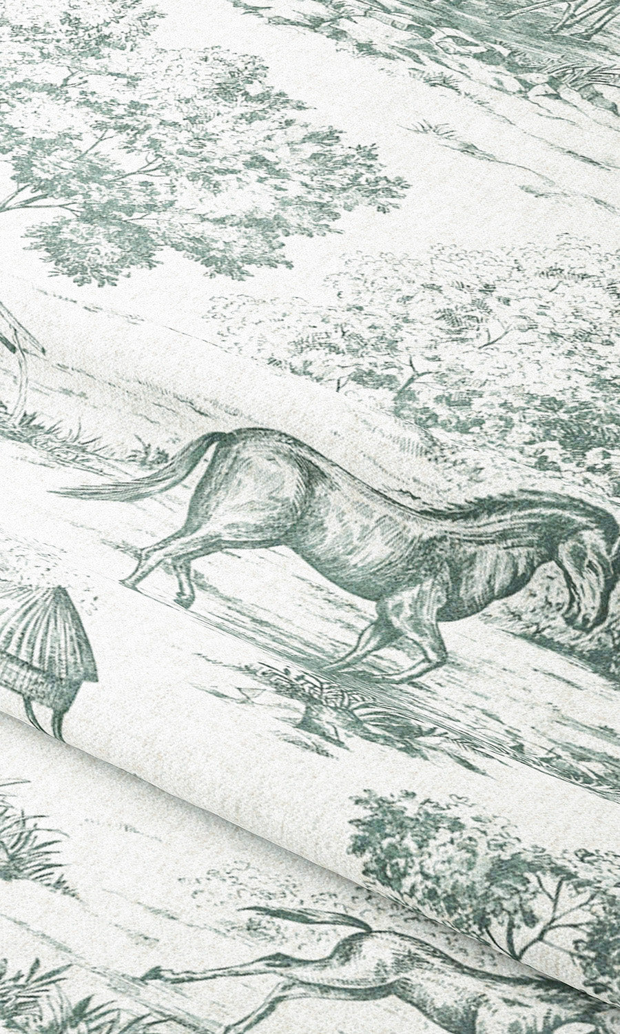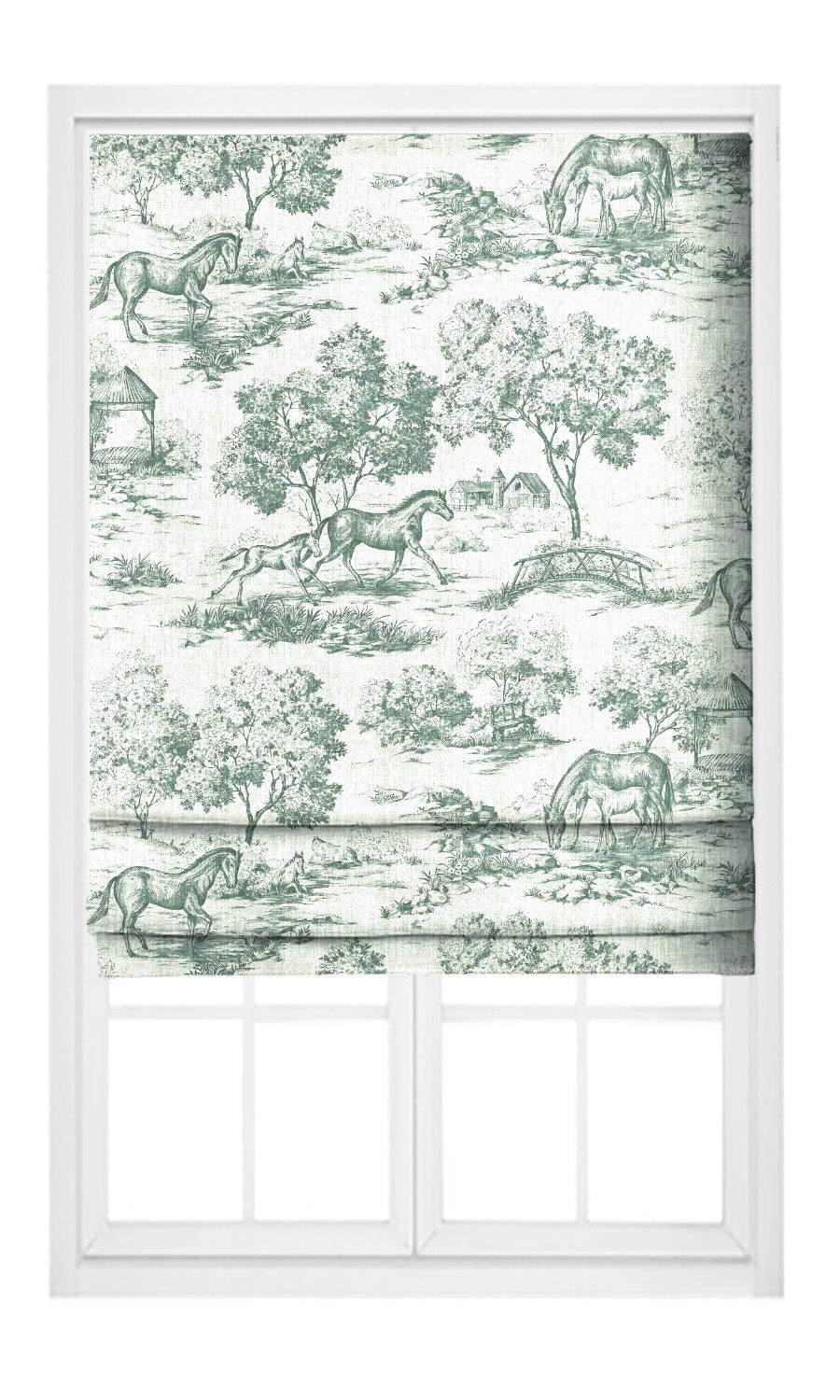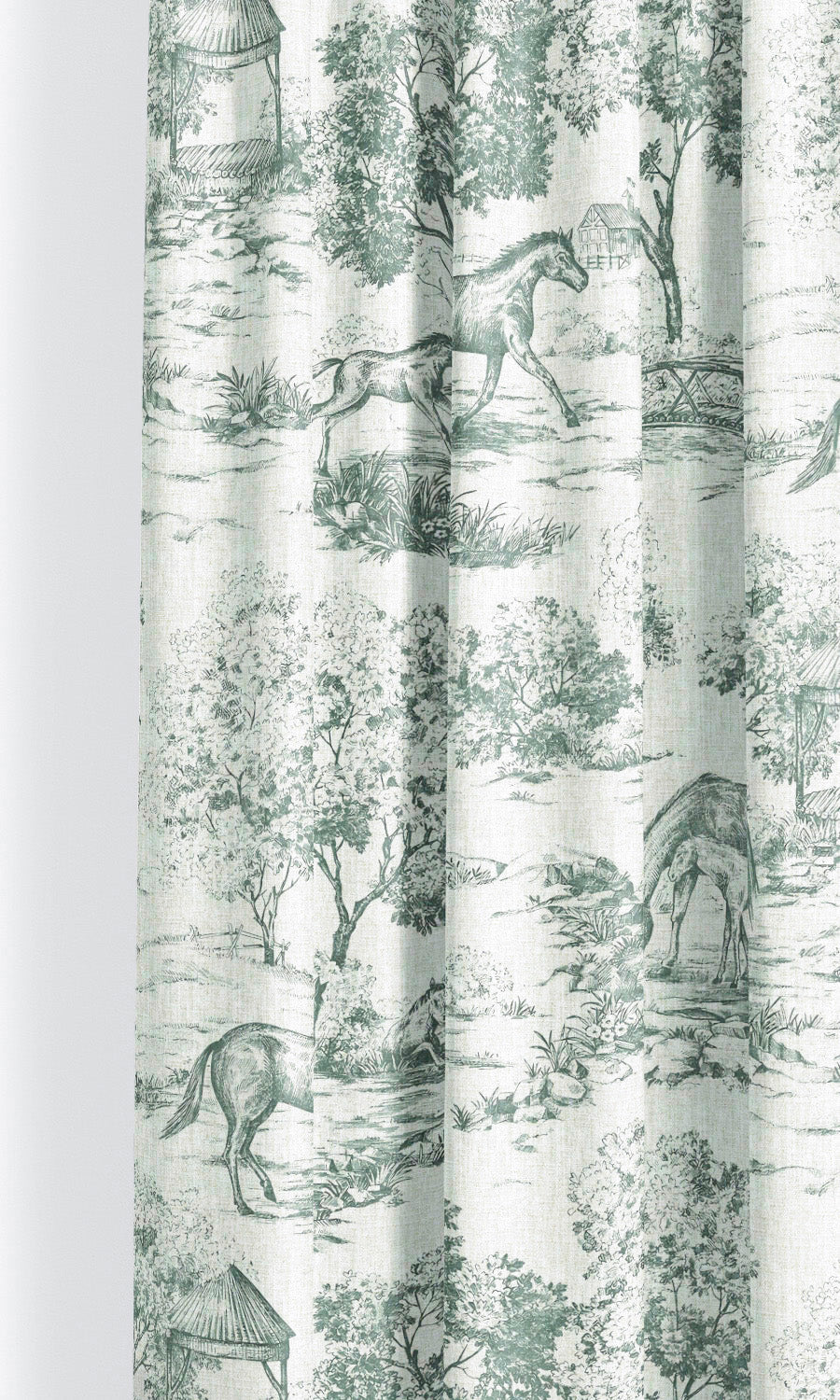 - Its classsical toile print that paints picturesque pastoral scenes of grazing and galloping horses amid lush trees, evoking the timeless charm of equestrian themes