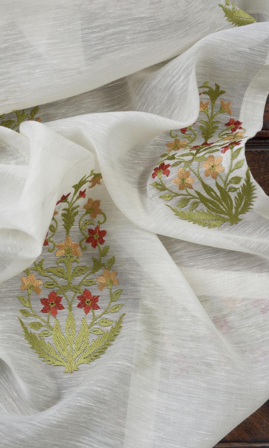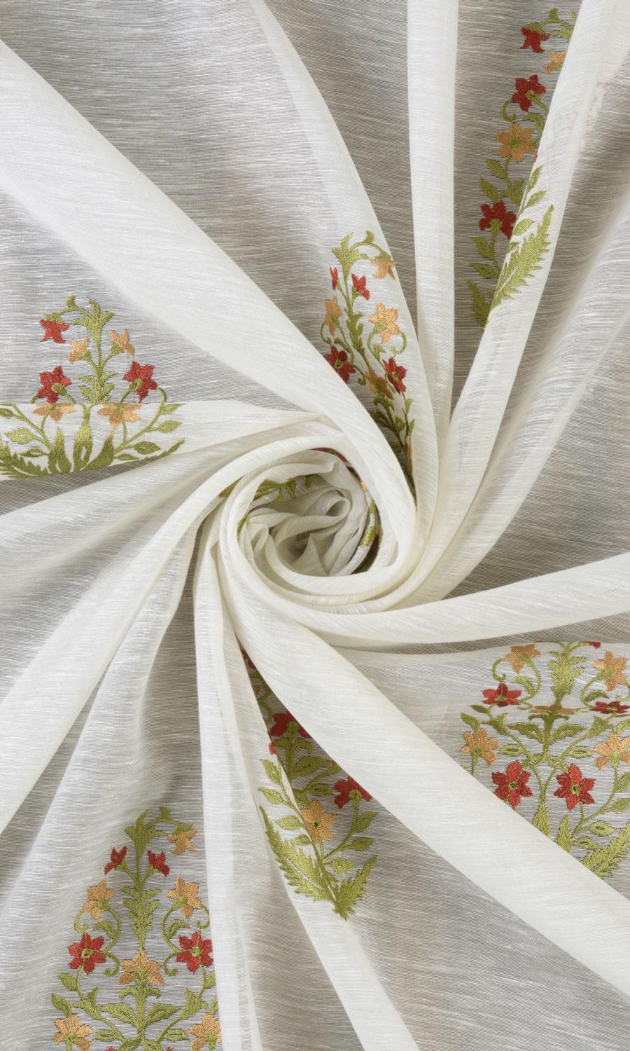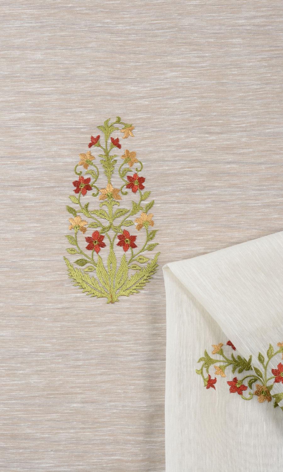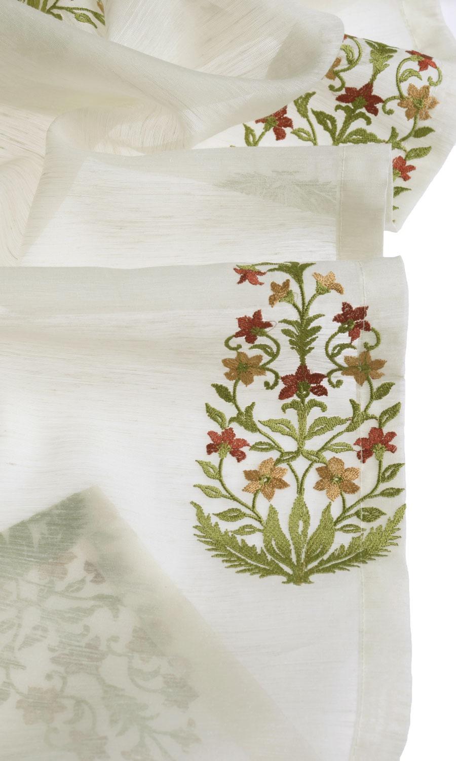 A showstopper paisley. Floral elegance in graceful colors and nimble embroidery merge with paisley to make a jaw-dropping feat. Mahzun will veritably steal the show, not with fanfare and hullabaloo, but with a soft whisper, a gentle breeze, a silent gaze! Pair with solid green drapery in a dreamy bedroom or let it shine alone on a sunny patio door - this diva will set the stage ablaze.