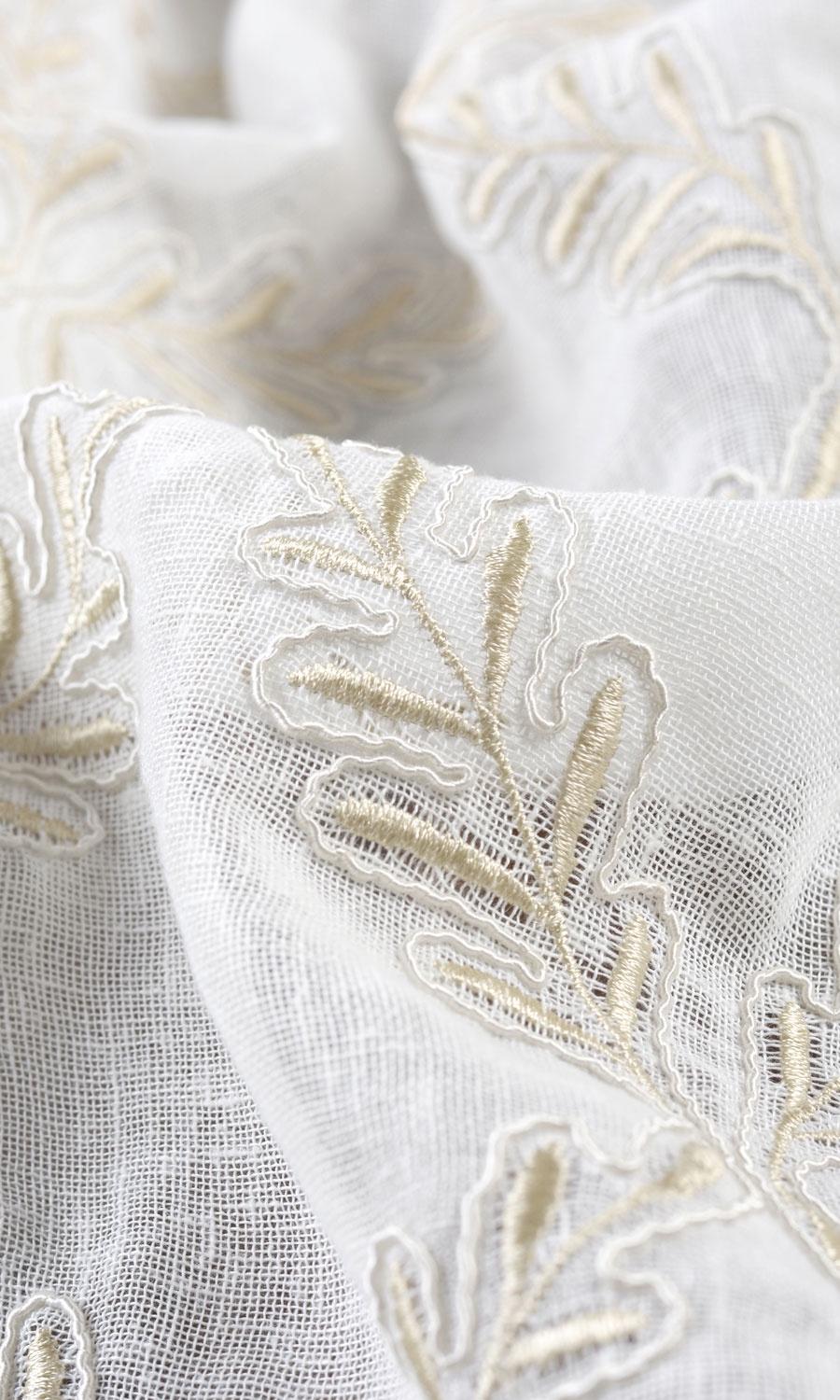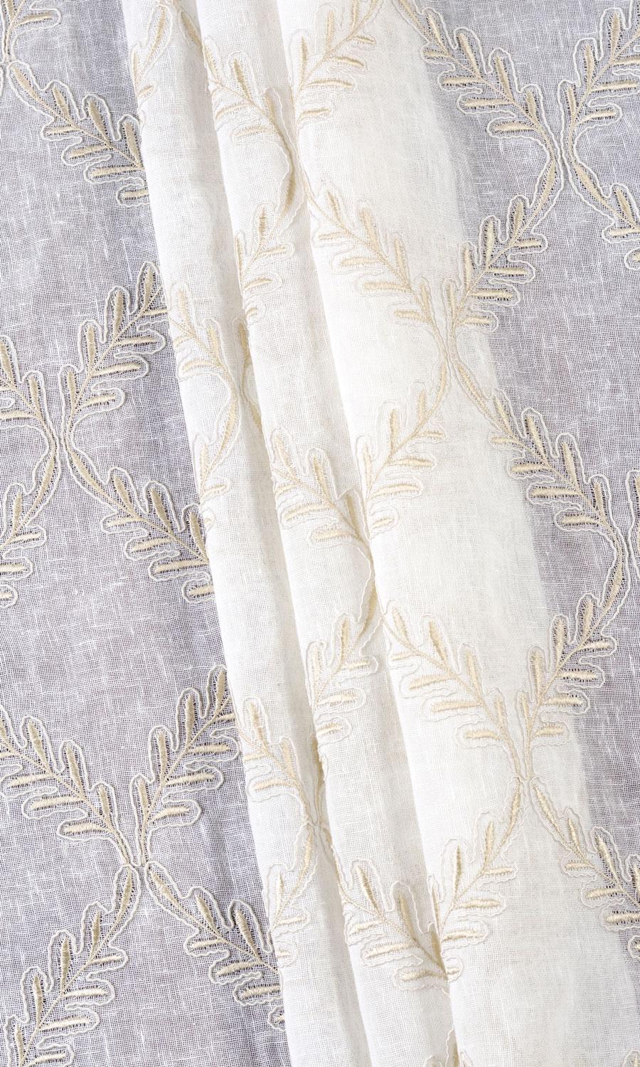 White sheers with a happy twist! 'Botanical' meets 'geometrical' in the embroidered rowan leaf motifs arranged to form a string of diamonds in this lovely fabric. The light beige-white combination helps to further a neutral color theme as well as to offset the vibrance of a color-filled scheme. Versatility at its best!