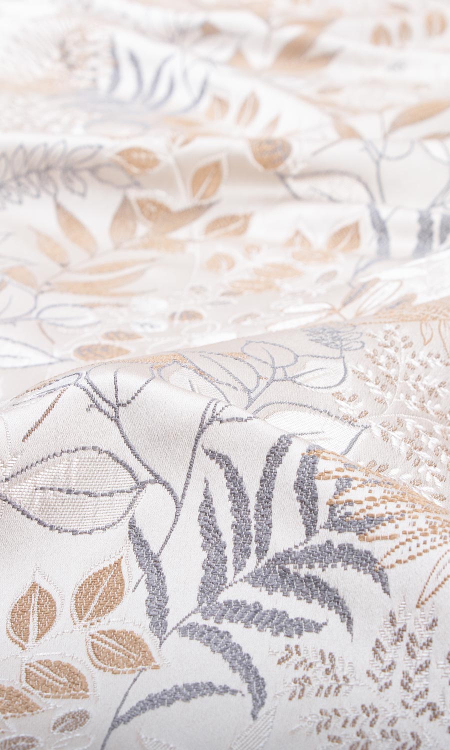 - Its soft ivory base with a touch of lustre for a lift, nestling beige and gray motifs