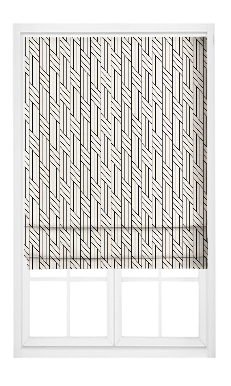 - Keep pattern play modern and sleek: Introduce Mevia roman shades to contemporary, streamlined interiors dominated by a neutral palette and modern motifs. Their geometric print adds interest, depth, and movement while the crisp black and white contrast keeps the palette modern and sophisticated.