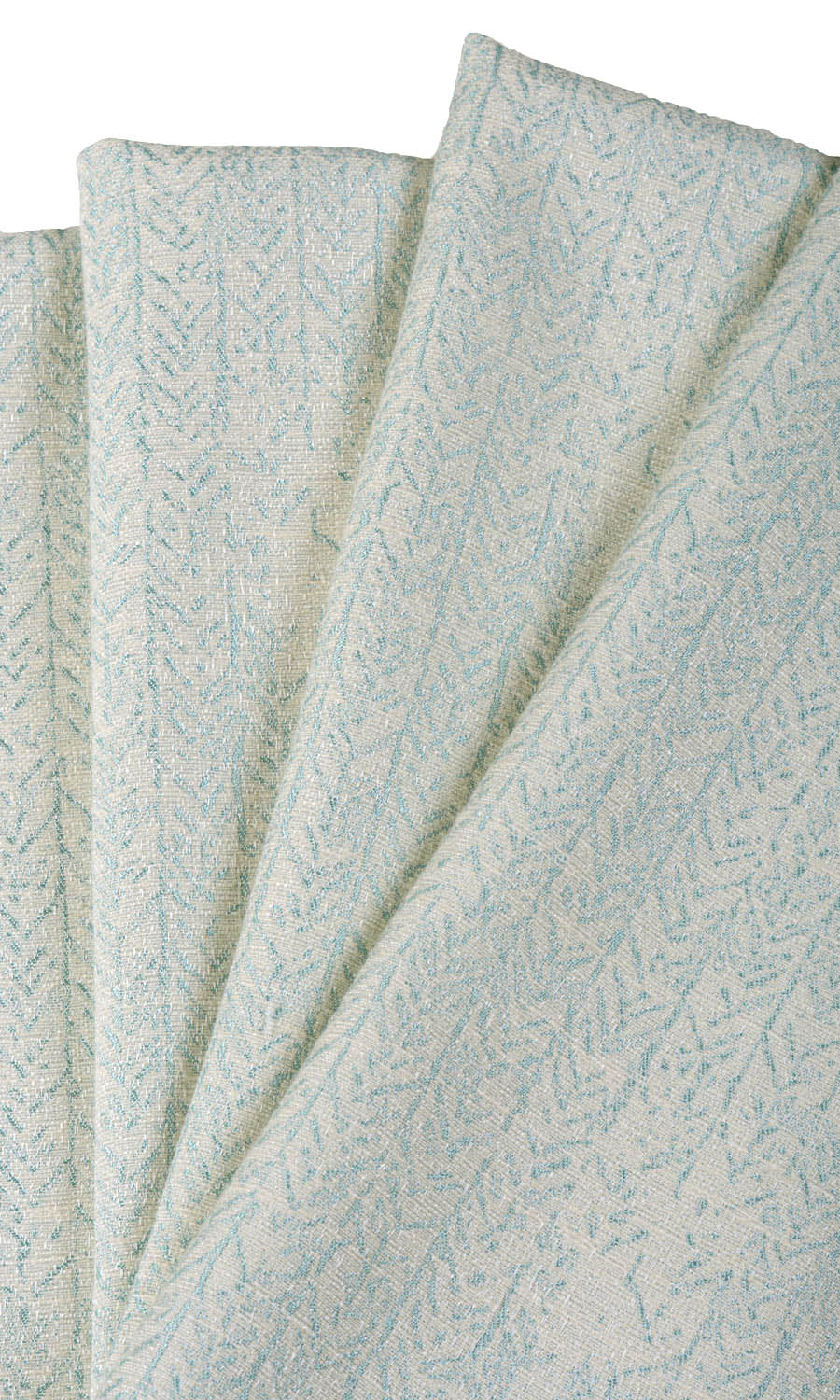 If you prefer minimalism with the barest hint of pattern in your drapery fabric pick, we recommend Nautilus. This off white polycot fabric is patterned with the palest blue for an understated look. The part-geometric, part-impressionist pattern has columns and chevron zigzags. The base fabric has a mildly rough woven look; the pattern also has a smudged feel that looks like a work of art.
