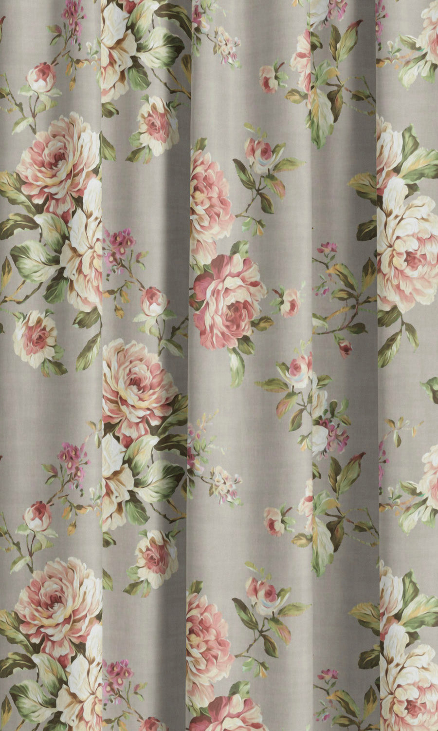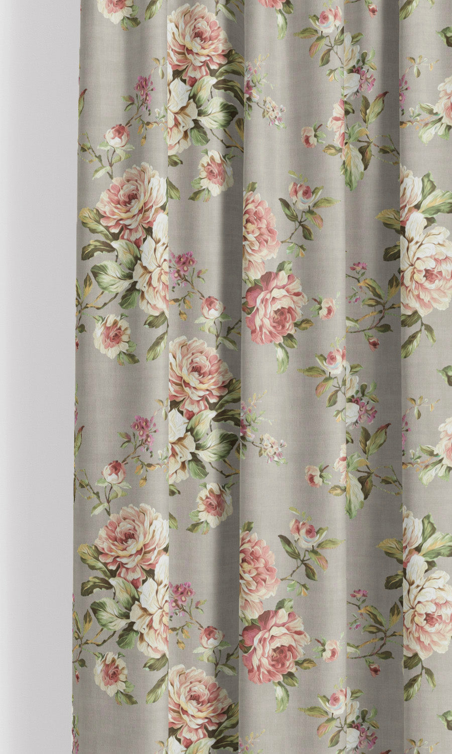 - Blush pinks and pale greens unfurl in an English floral reverie against the gentle hush of soft gray