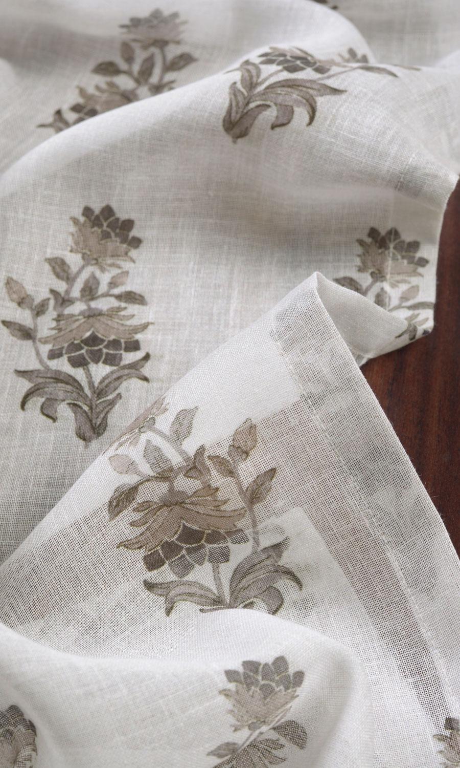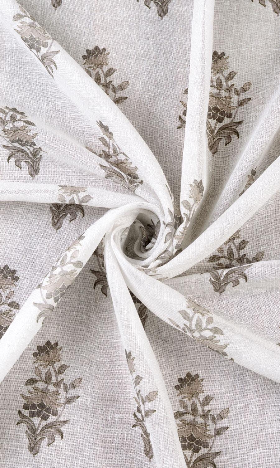 A white sheer with a floral surprise. Neval allures not with busy patterns or deep colors but with softness and quietness. Floral branchlets in an understated palette of greige and grey sprinkled across a gossamer white bring on a dreamy elegance and nature-inspired themes. Its small-scale pattern in neutral colors make it a versatile piece capable of teaming up with most patterns and palettes.