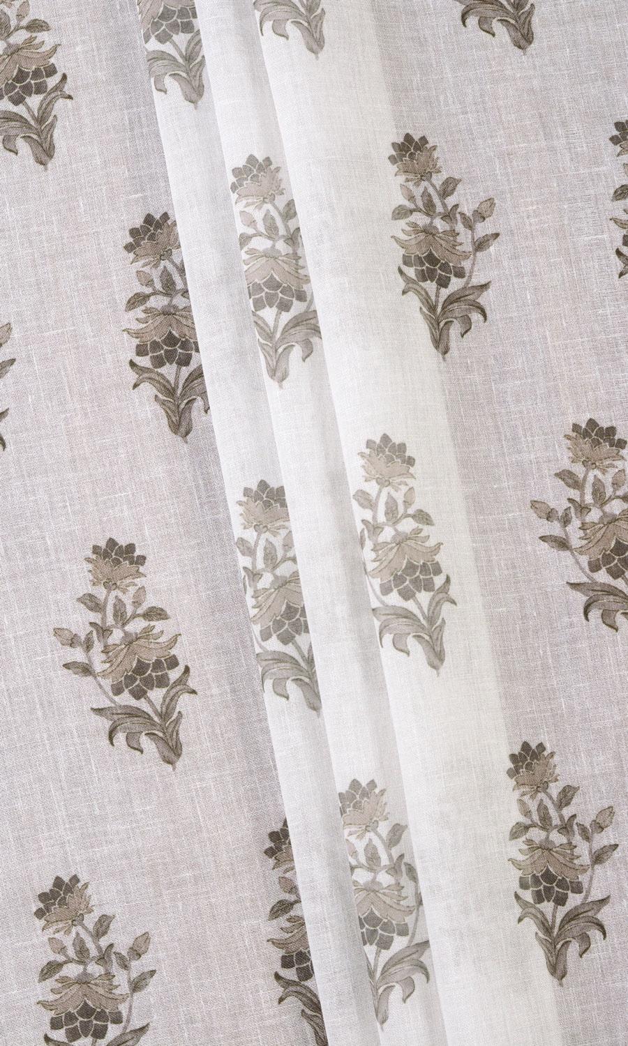 A white sheer with a floral surprise. Neval allures not with busy patterns or deep colors but with softness and quietness. Floral branchlets in an understated palette of greige and grey sprinkled across a gossamer white bring on a dreamy elegance and nature-inspired themes. Its small-scale pattern in neutral colors make it a versatile piece capable of teaming up with most patterns and palettes.