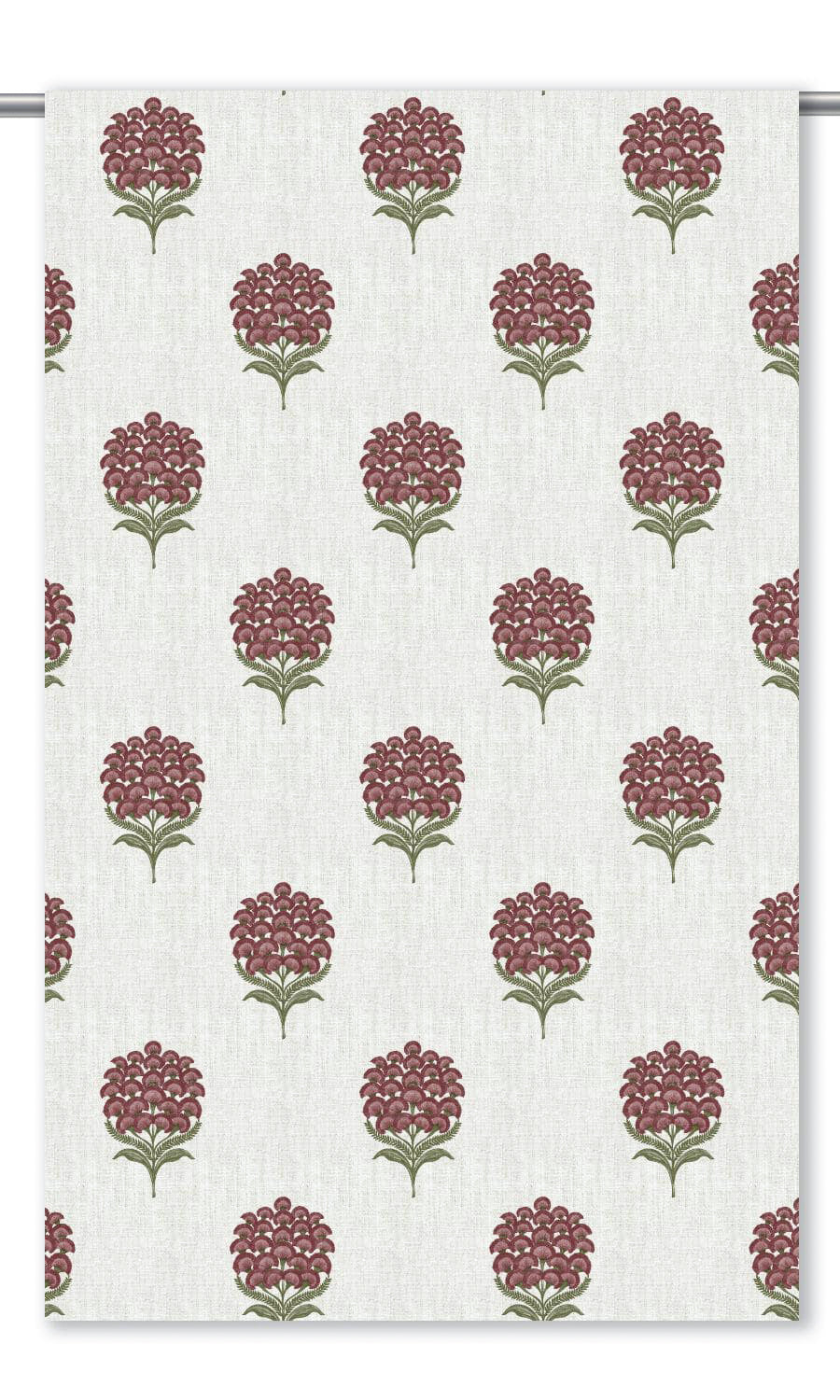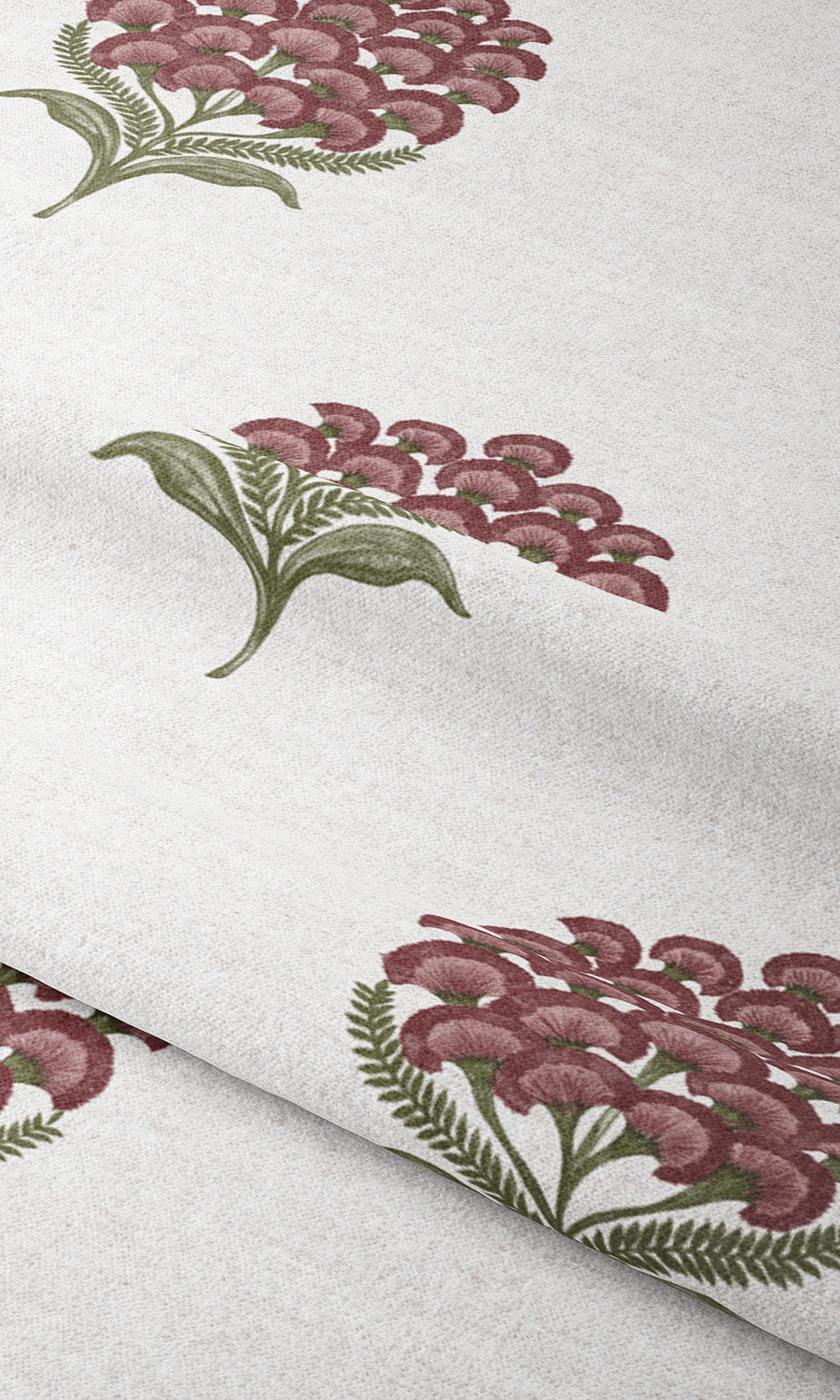 - Layers of burgundy red and hints of olive green conjure a blossoming garden upon an airy white canvas