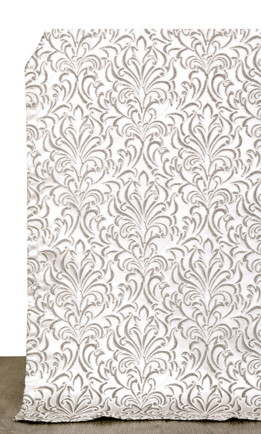 If you are like the eternally beautiful combination of black and white, take a look at this beautiful damask fabric. Its white backdrop is self patterned all-over with black in a classic foliage design to create a stunning and somewhat gray look. We recommend pinched pleated curtain style to evoke maximum oohs and ahs!