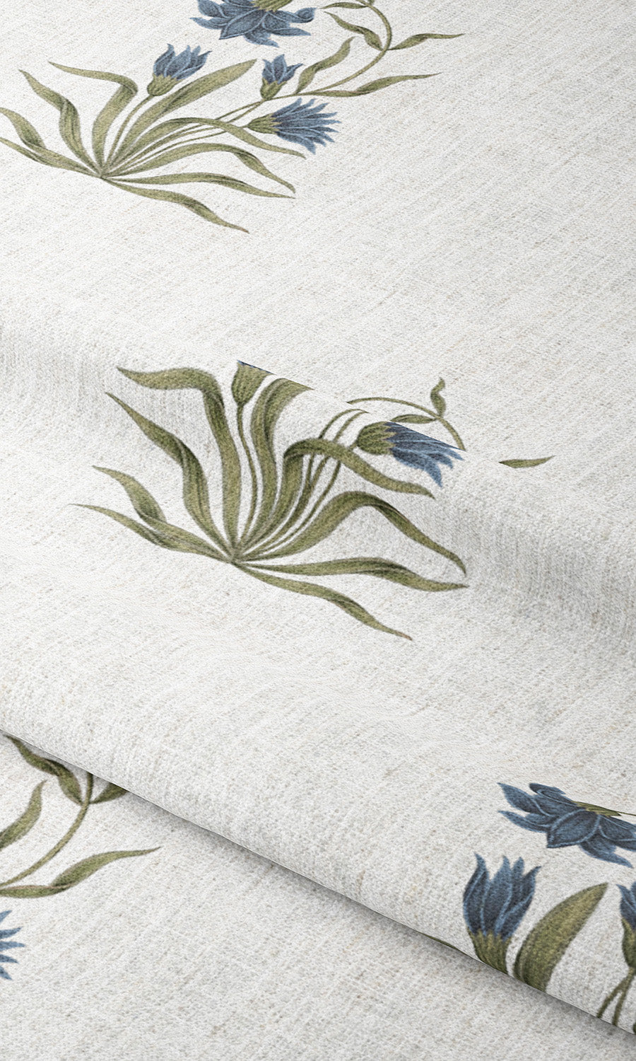 - Navy blue and olive green paint a floral tableau on serene cream, evoking soft, timeless elegance