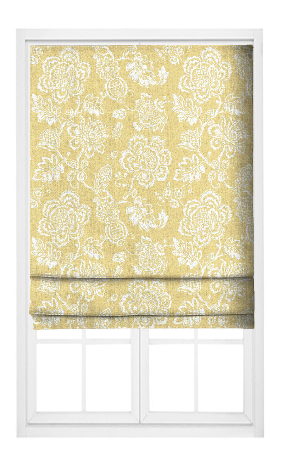 - Add to shabby chic interiors: Dress the windows of a romantic shabby chic haven with Nirvana Frock roman shades. Their pastel yellow with chalk white florals, coupled with the lived-in charm of linen texture, perfectly blend with the style's curated mix of vintage accents and nature-inspired motifs. Pair them with ruffled bedskirts, distressed furniture, and chunky throws to summon an air of nostalgia, like a page stolen from a well-loved storybook.