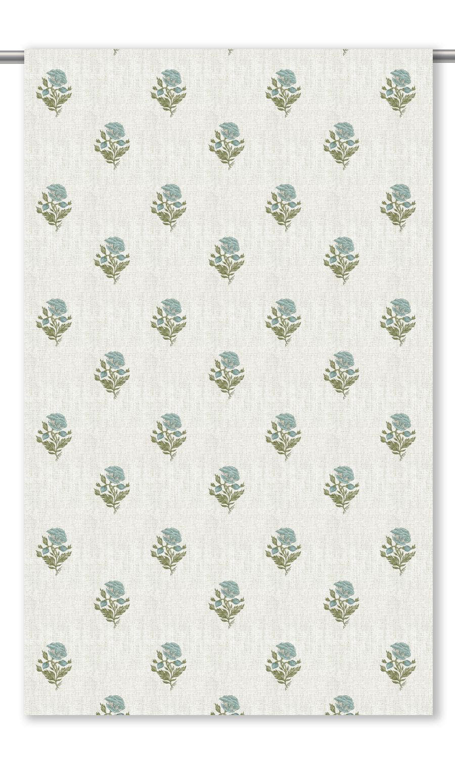 - Powder blue and green awaken floral exuberance on the hush of a serene white canvas