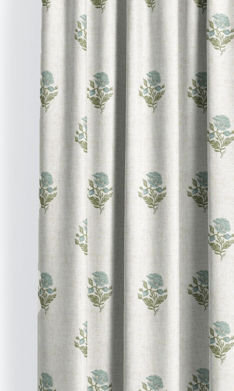 • Powder blue and green awaken floral exuberance on the hush of a serene white canvas