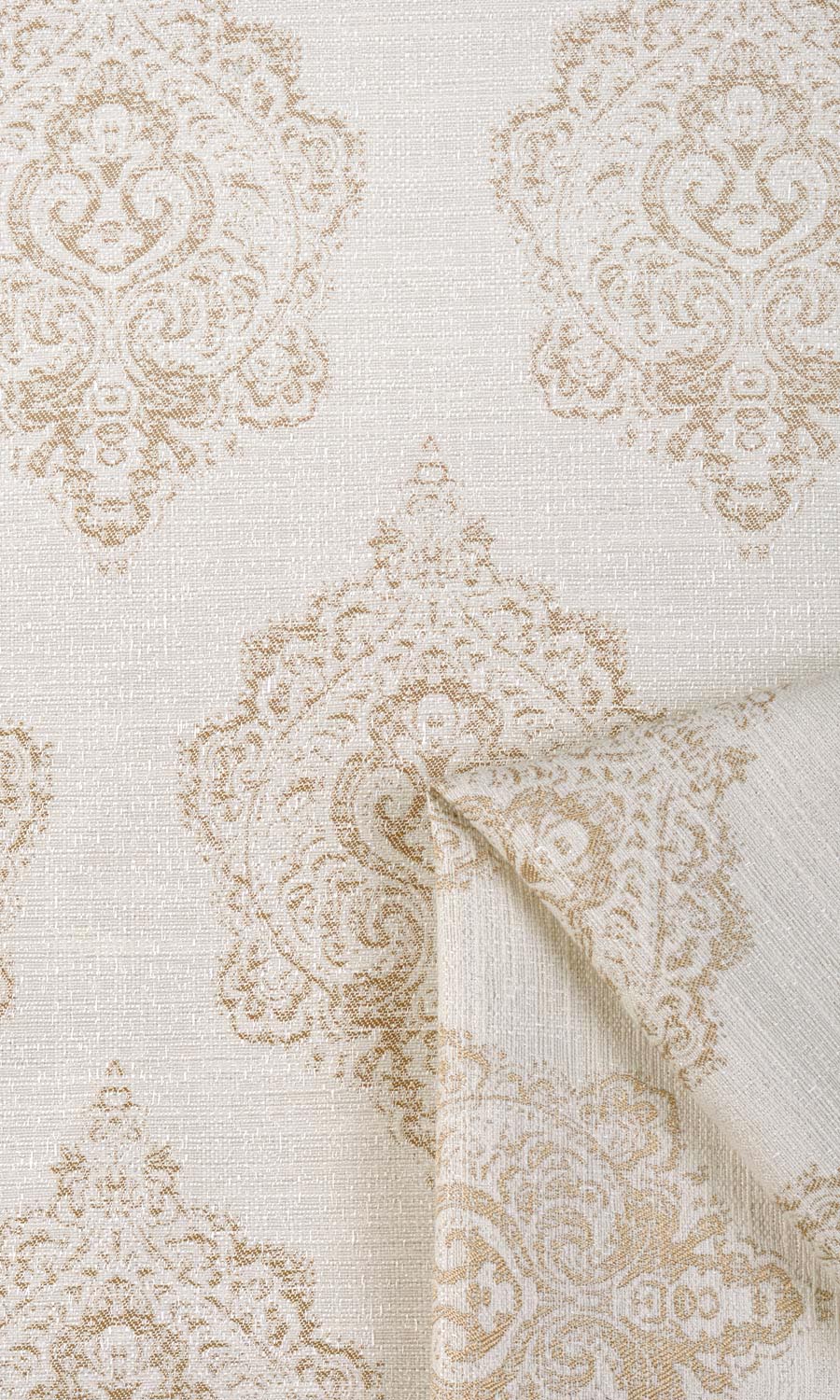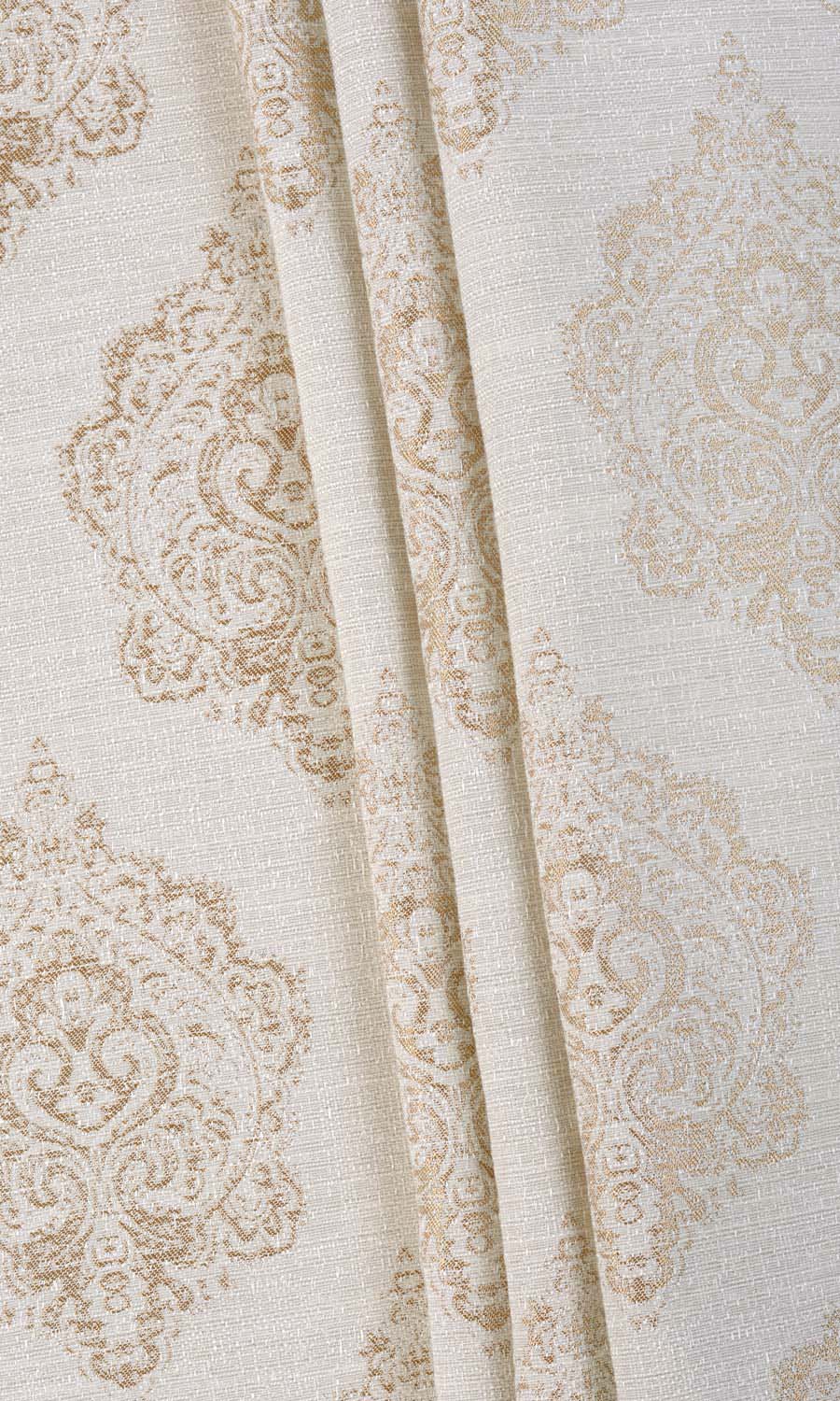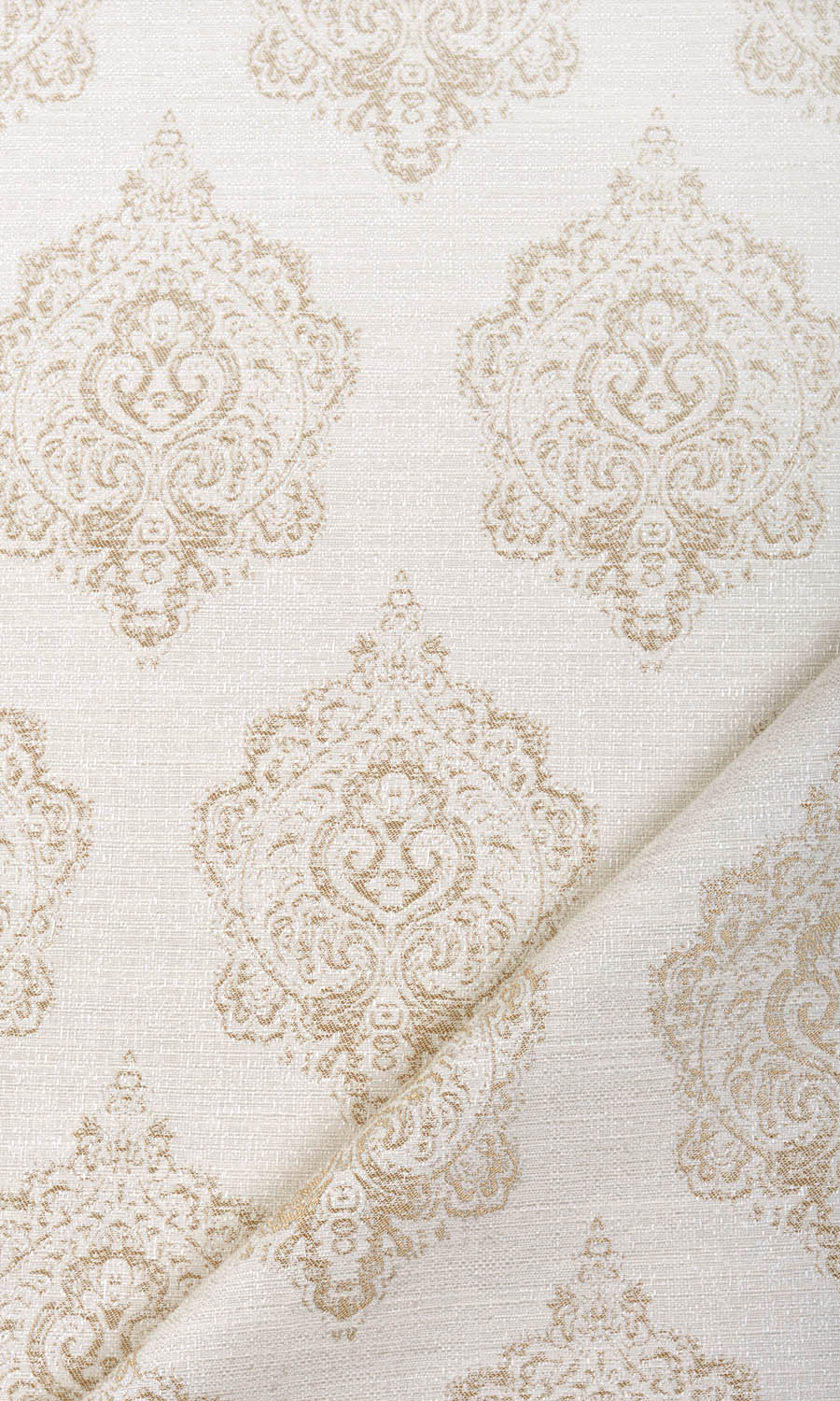 If you like traditional jacquard motifs but dislike intense color palettes and overly ornate design elements, Old Lace should appeal to you. This sturdy polycot drapery fabric has an off-white base patterned with a traditional, oversized and stylized botanical motif in pale brown. The texturally rich base and the raised pattern look good together; as does the simple no-fuss color combination.