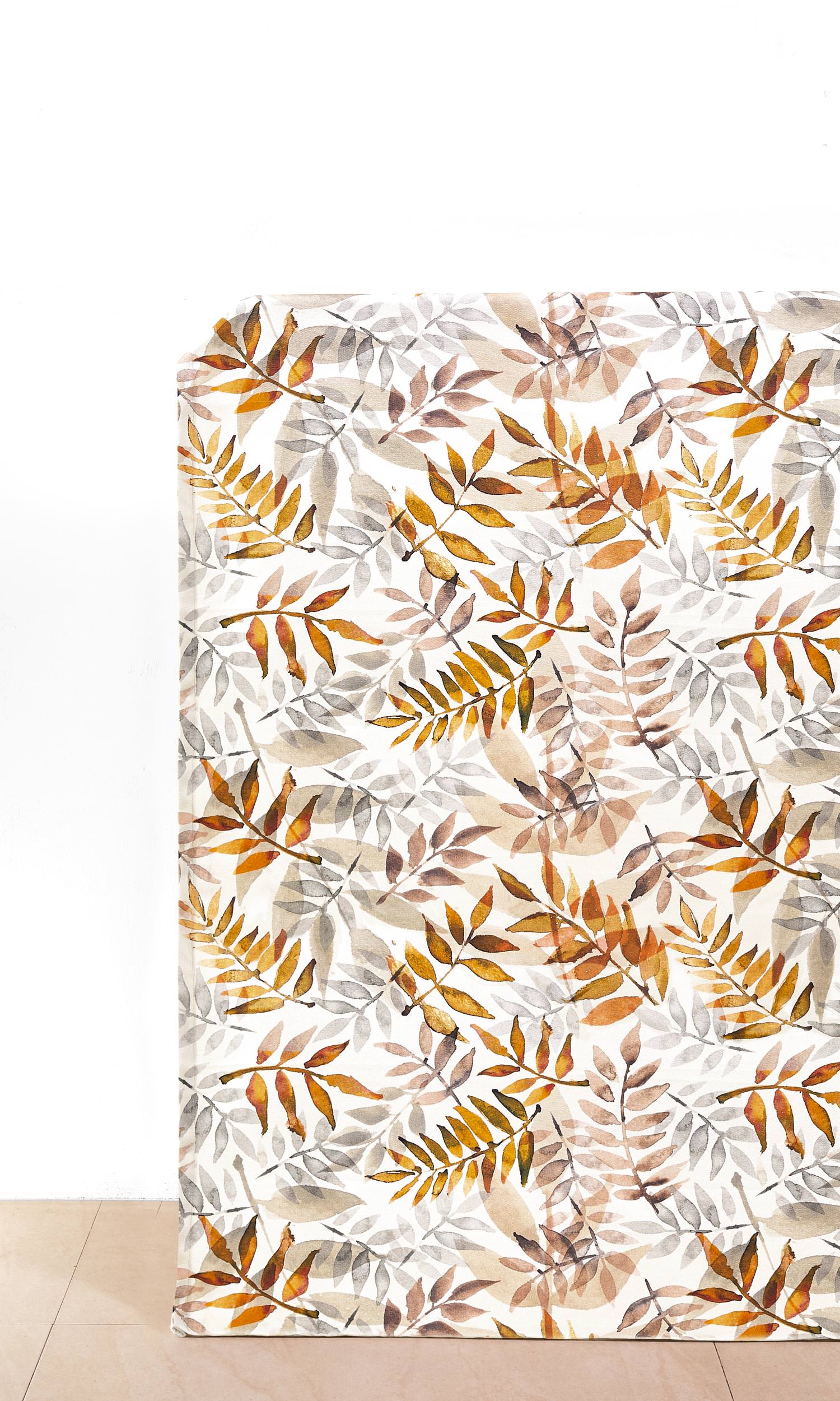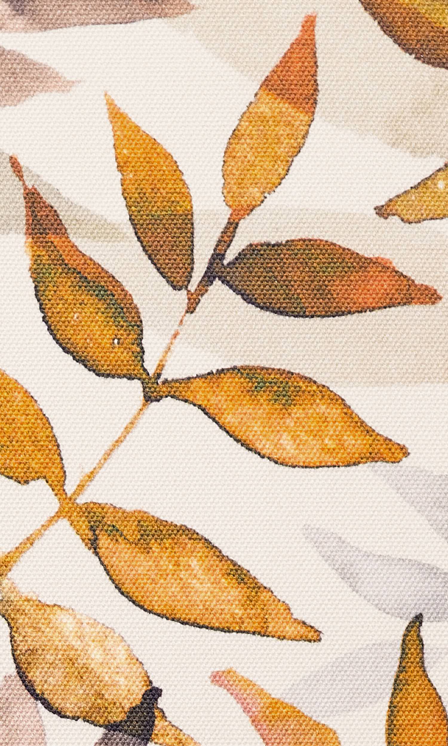 This tasteful fabric features fern frond motifs in shades of ocher yellow, cinnamon brown and slate gray on a white backdrop. The overlapping and layered watercolor look combined with rich earthen palette creates a luminous and lovely look. Perfect for a semi-formal or informal space.