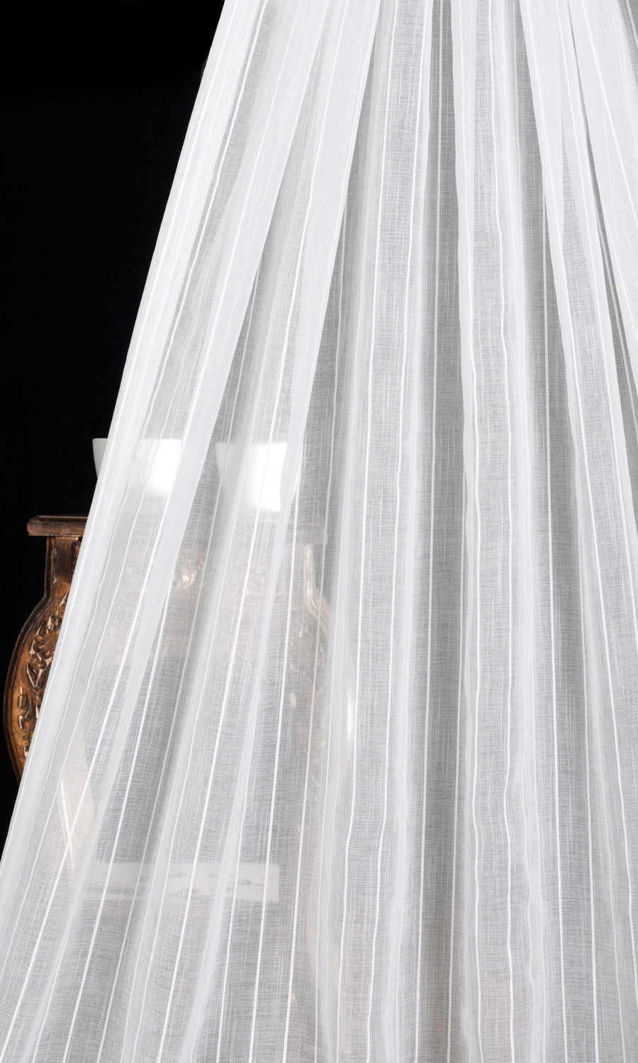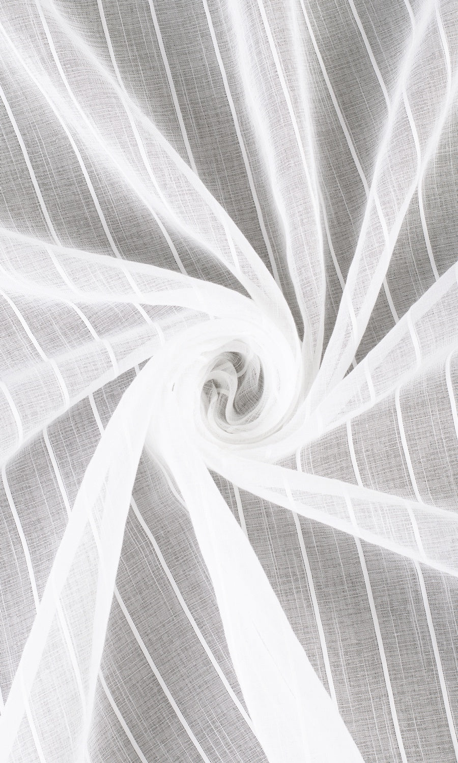 The epitome of simplicity and ethereal charm! A pure white sheer with a wee bit of detail hidden in its self-patterned stripes, 'Pearl Halo' offers the dreamy elegance that sits right in a coastal home, a country cottage and a modern condo with equal ease. Light, breathable and timelessly elegant, this sheer is characterized by a calm, uncluttered visual appeal and guarantees privacy during the day while welcoming light.
