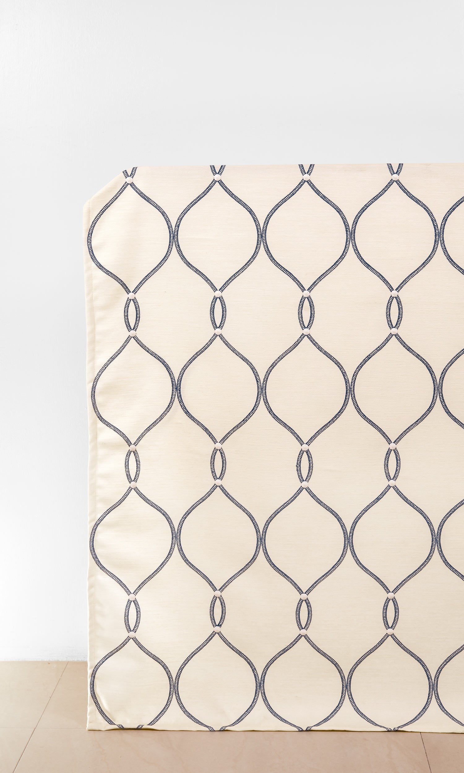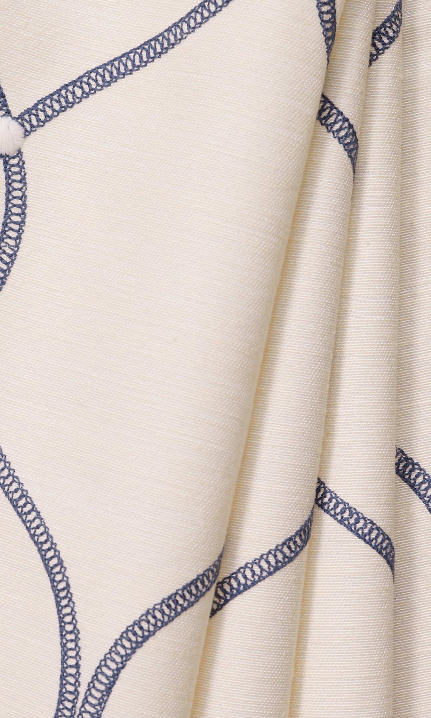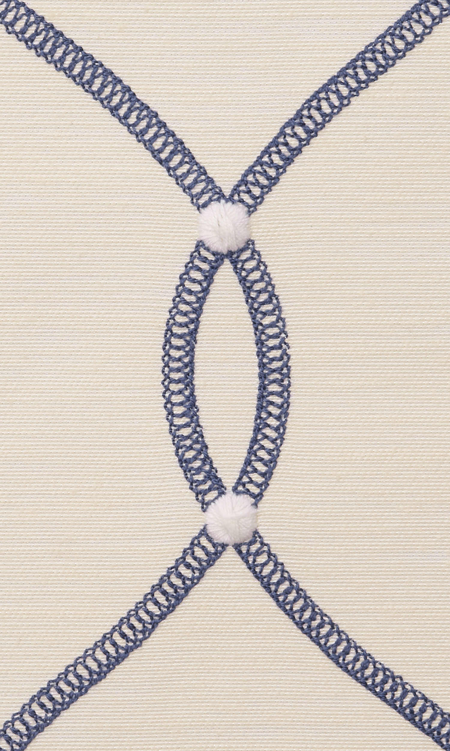 Bring an easy-breezy ambience to your space with this lovely lattice look embroidered fabric. Its pristine white backdrop has been embroidered with navy blue thread in a ribbon-inspired stitch to create a contemporary lattice design. White dots of embroidery at lattice nodes add further textural detail. This fabric works well for roman shades too.